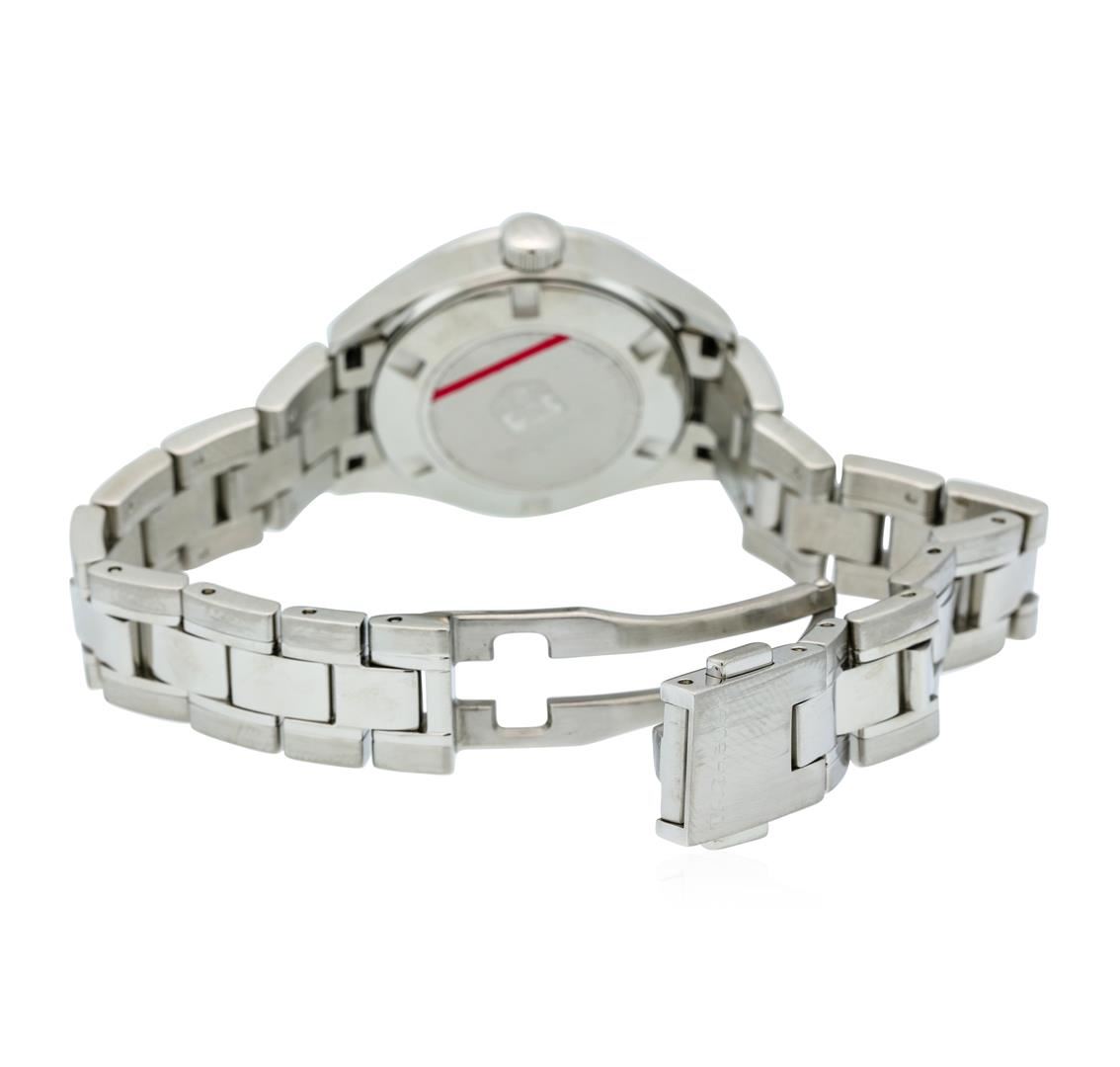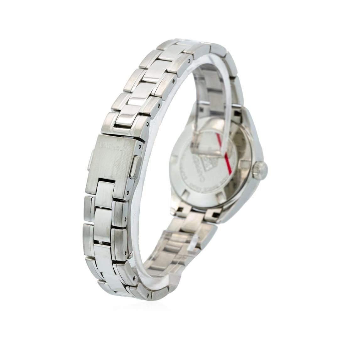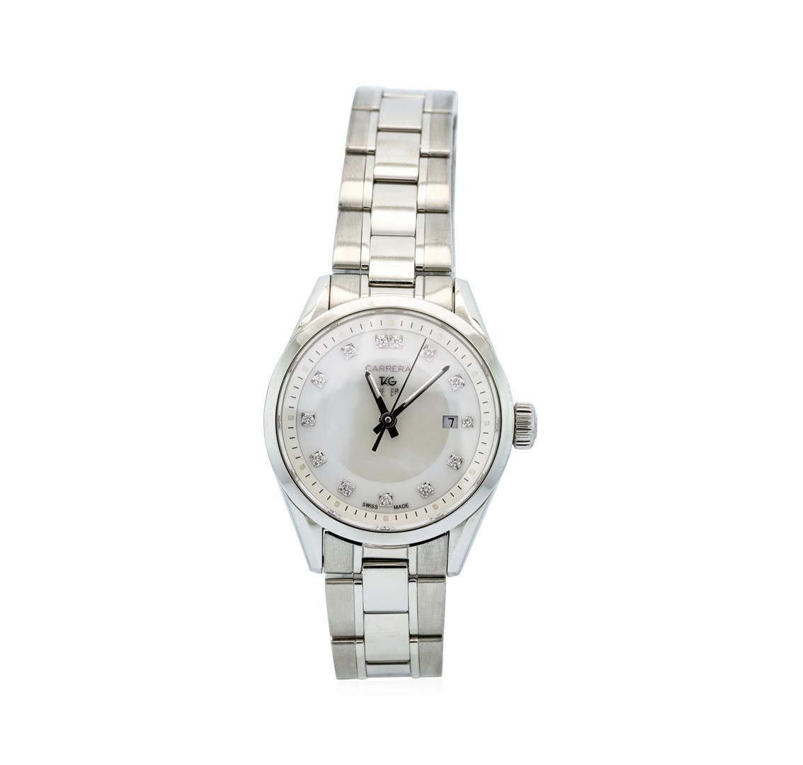 One Tag Heuer Carrera stainless steel watch, measuring 36mm with a mother of pearl dial, diamond hour markers with double diamonds at the 12 o'clock position and a date window at the 3 o'clock position, attached to a metal Tag Heuer bracelet.