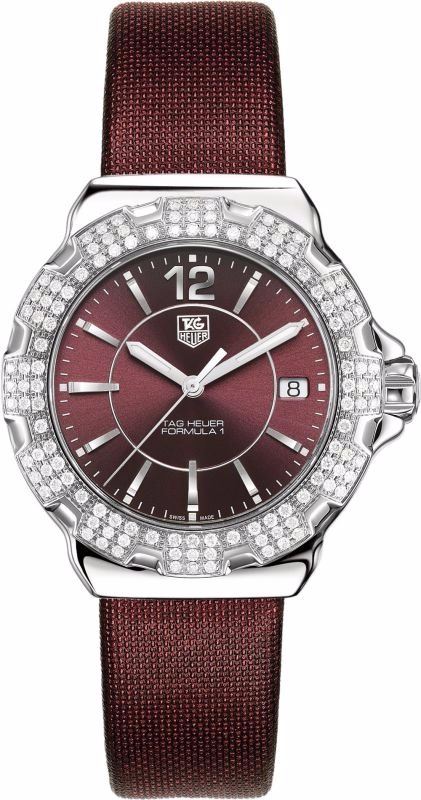 Model: WAH121B.FC6223 - CASE = [Material:Polished Stainless Steel], [Case Diameter:37], [Bezel:Set with 120 (0.75 Carat) Top Wesselton Diamonds], [Case Back:Solid], [Water Resistant:200 Meters / 650 Feet], [Crystal:Scratch Resistant Sapphire],; DIAL = [Color:Maroon with Date at 3],; MOVEMENT = [Type:Battery Powered Quartz Swiss], [Crown:Screw Down],; BAND = [Clasp:Deployment Buckle], [Type:Maroon Satin], (Usually ships in 1 to 2 weeks.)