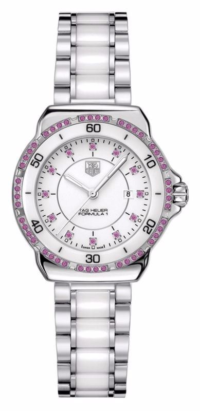 Model: WAH1319.BA0868 - CASE = [Material:Polished Stainless Steel], [Case Diameter:32], [Bezel:White Ceramic set with 48 Pink Sapphires (0.46ct)], [Case Back:Solid], [Water Resistant:200 Meters - 660 Feet Water Resistant], [Crystal:Scratch Resistant Sapphire],; DIAL = [Color:White with 12 Pink Sapphires Hour Markings (0.11ct)],; MOVEMENT = [Type:Battery Powered Quartz],; BAND = [Clasp:Deployment Buckle], [Type:Stainless Steel and White Ceramic], (Usually ships in 2 to 4 weeks.)
