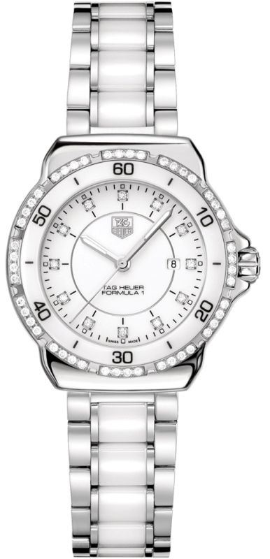 Model: WAH1313.BA0868 - CASE = [Material:Polished Stainless Steel], [Case Diameter:32], [Bezel:Set with 60 Diamonds (0.35ct)], [Case Back:Solid], [Water Resistant:200 Meters - 660 Feet Water Resistant], [Crystal:Scratch Resistant Sapphire], DIAL = [Color:White], MOVEMENT = [Type:Battery Powered Quartz], BAND = [Clasp:Deployment Buckle], [Type:Stainless Steel and White Ceramic], (In Stock - Ready to ship.)