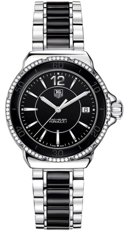Model: WAH1212.BA0859 - CASE = [Material:Polished Stainless Steel], [Case Diameter:37], [Bezel:Fixed with 60 Diamonds], [Case Back:Solid], [Water Resistant:200 Meters / 660 Feet], [Crystal:Scratch Resistant Sapphire], DIAL = [Color:Black], MOVEMENT = [Type:Battery Powered Quartz], [Crown:Screw Down], BAND = [Clasp:Deployment Buckle], [Type:Stainless Steel with Black Tone Ceramic], (In Stock - Ready to ship.)