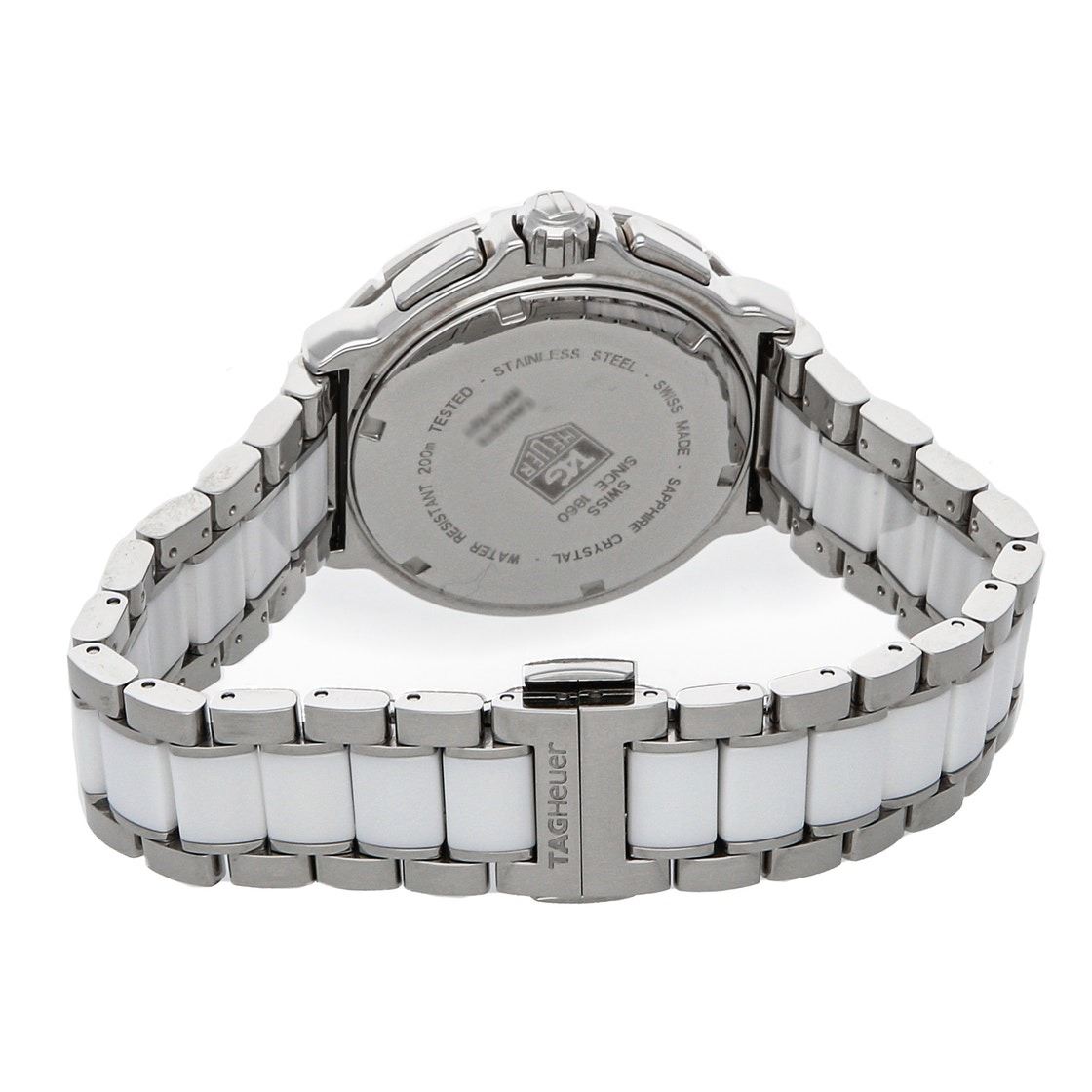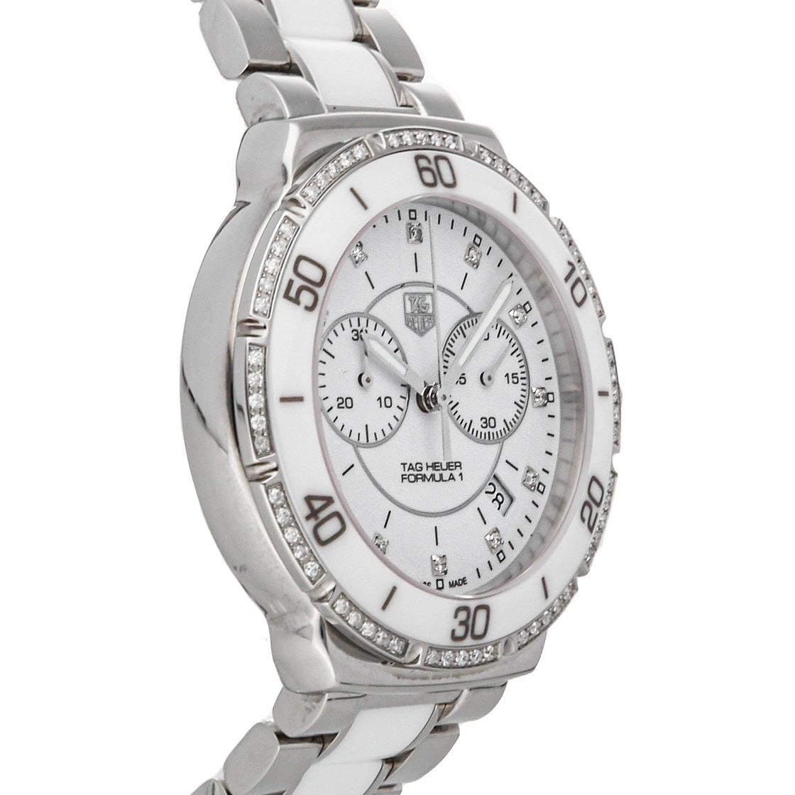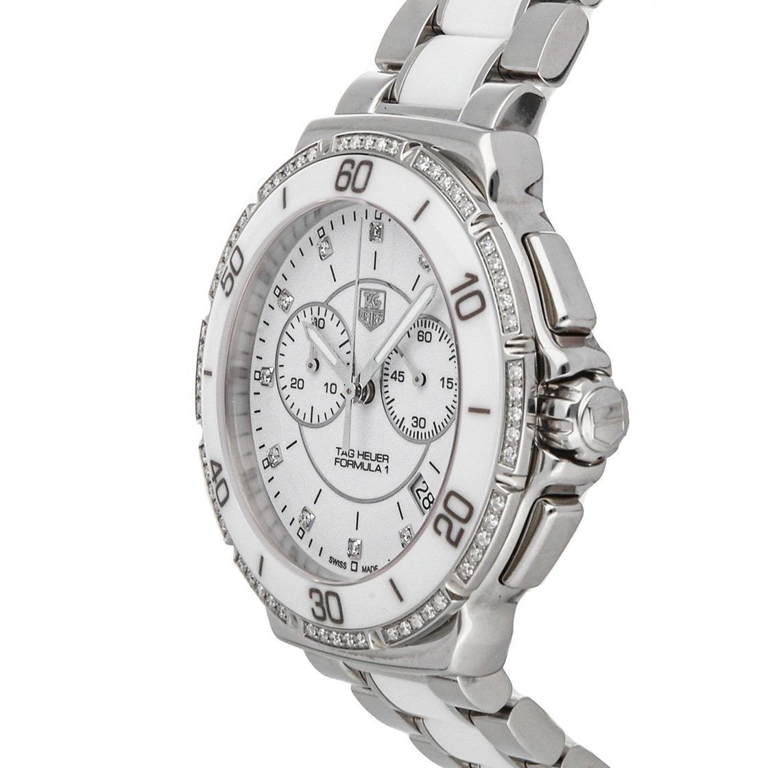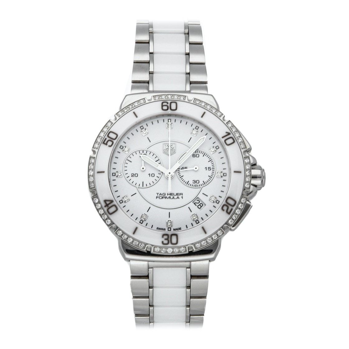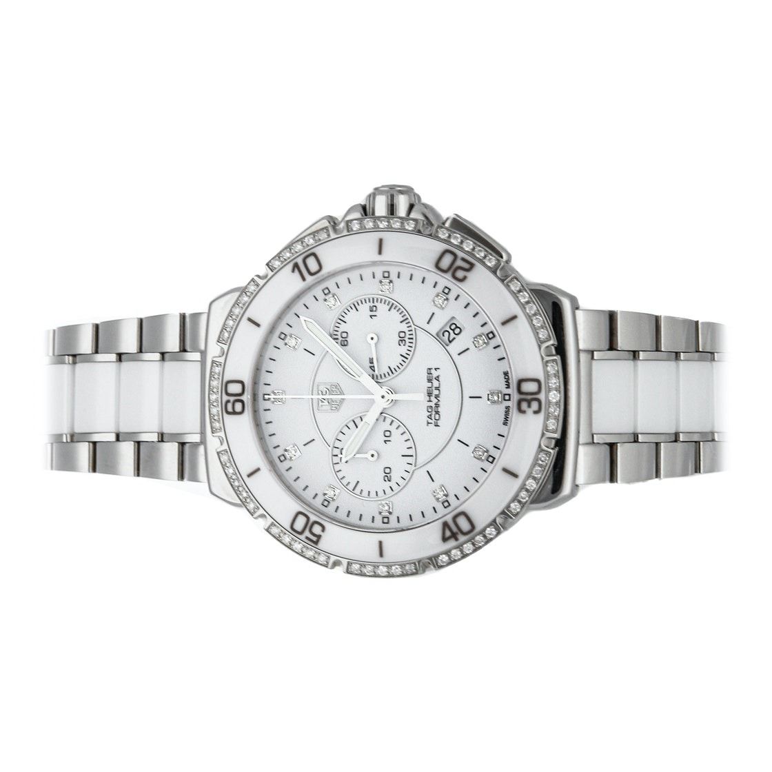 Pre-Owned Tag Heuer Formula 1 Chronograph (CAH1213.BA0863) quartz watch, features a 41mm stainless steel case with a white ceramic bezel surrounding a white diamond dial on a stainless steel and white ceramic bracelet with folding buckle.