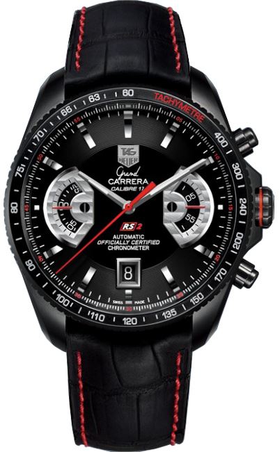 Model: CAV518B.FC6237 - CASE = [Material:Black PVD Titanium], [Case Diameter:43], [Case Thickness:16mm], [Bezel:Fixed], [Case Back:See-thru Sapphire], [Water Resistant:100 Meters - 330 Feet], [Crystal:Sapphire Crystal], DIAL = [Color:Black Red Accented Chronograph with Date at 6], MOVEMENT = [Type:Automatic Self Winding Calibre 17 RS], [Crown:Winding], BAND = [Type:Black Crocodile Leather with Red Underside and Stitching], (Usually ships in 1 to 2 weeks.)