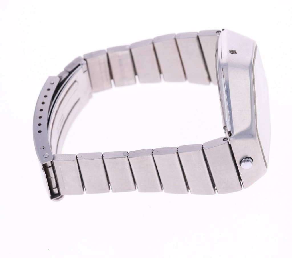 This is an original Swiss Tag Heuer Manhattan Chronosplit GMT 104.403 wrist watch circa 1970’s. The Manhattan Chronosplit GMT shows a traditional analog quartz Chronosplit movement with digital time above sitting an a unique bullhead chronograph layout with six-sided stainless steel case. This version shows the stainless steel case with factory original stainless steel Heuer marked bracelet having the 104.403N black dial with white indices having cream dots at each point. There is a small date window just below the 3 indices. The watch exhibits two Tag Heuer movements: the top having a Heuer Caliber 104 movement and the bottom a Heuer quartz citizen movement. The watch is marked on the bottom Assembled in Switzerland along with the reference number of 104.403 and serial number of 363706. The Manhattan began production in 1970 and was eventually discontinued in 1982, the same year that Heuer was sold to Piaget / Nouvelle Lemania. The iconic shape of the coffin like elongated hexagon beveled case along with the short run and double movement makes the Manhattan a highly collectible Tag Heuer. The bottom movement functions and has a fresh battery on it, the bottom not turning on. There is expected handling wear, small scuffs on the case and band, the Heuer clasp opens and closes, the lower movement functions and the upper movement's functionality is either not working or unknown. U6.