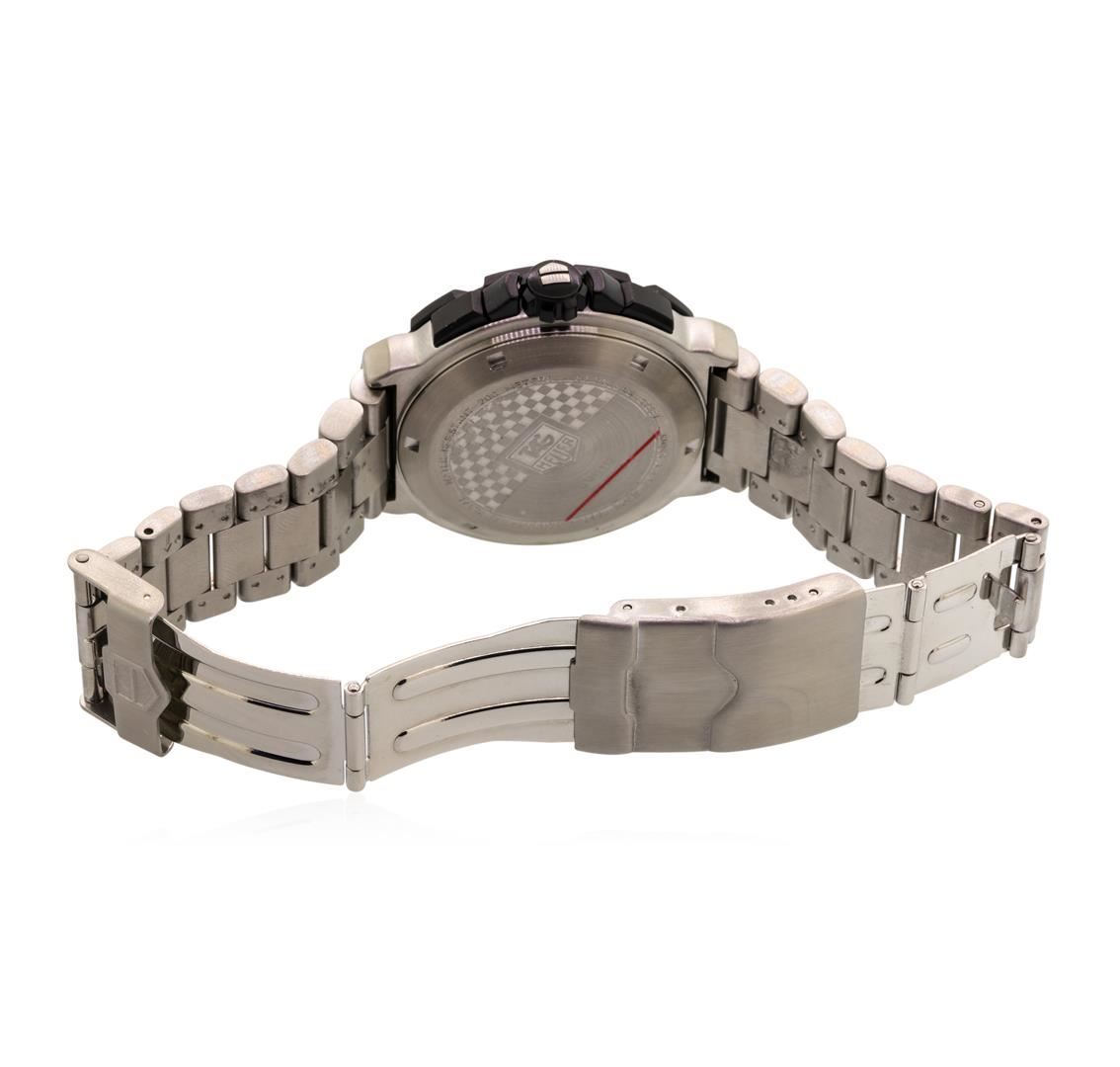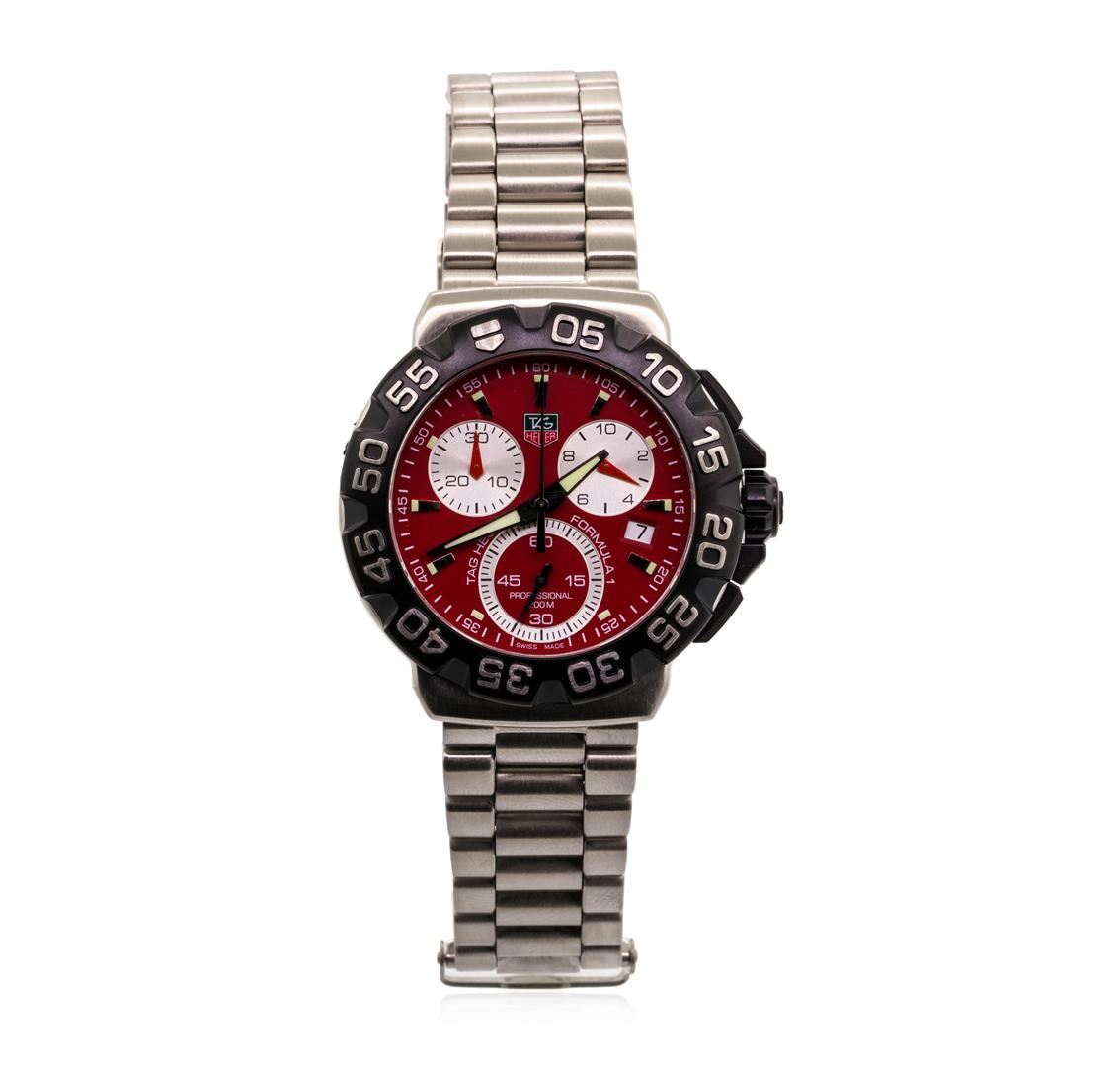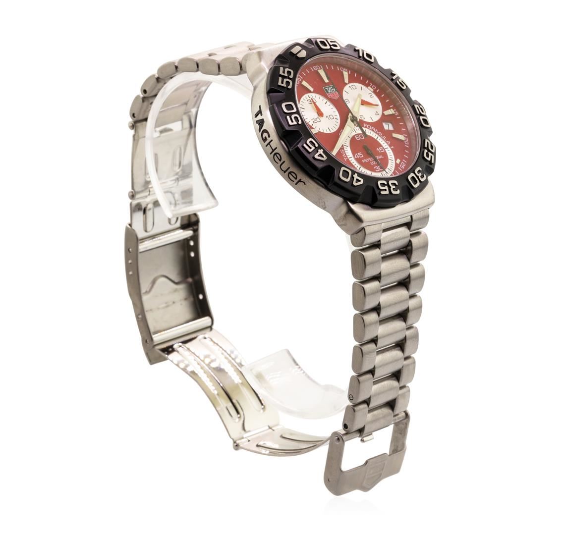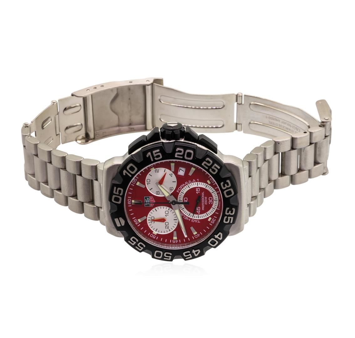 One men's Tag Heuer Formula 1 Chronograph titanium and carbide steel wristwatch with an attached titanium bracelet. Serial #: REJ3800, Model #: CAH1112. Crown: fluted, screw-down. Bezel: unidirectional rotating carbide steel. Crystal: synthetic sapphire. Movement: quartz. Dial: red with three sub-dials and silver stick marker numerals, baton pointed type hands. Calendar: between 3 and 4 o'clock. Bracelet: matching titanium with a deployment clasp. Case: 44mm. The watch has a total weight of 122.4 grams.