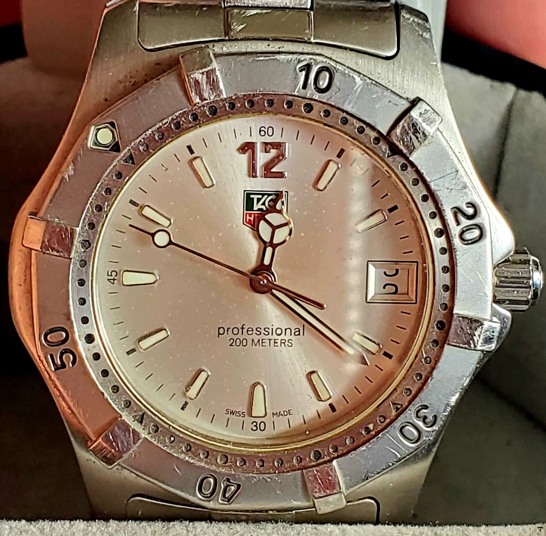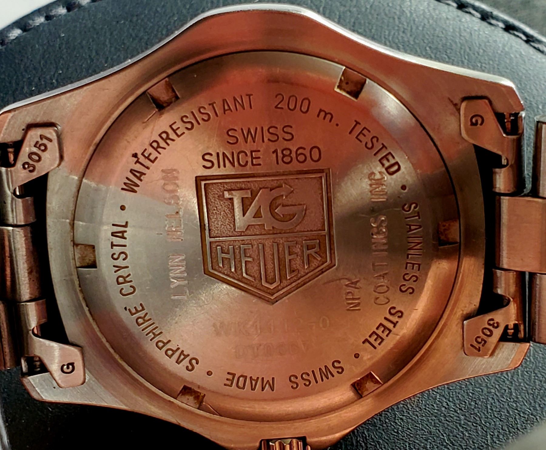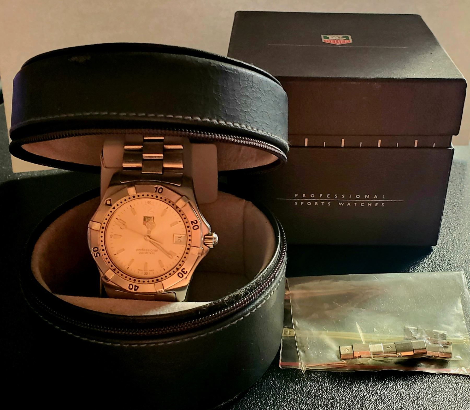 Tag Heuer Aquaracer Professional Watch Wk 1112-0. This Swiss Made watch has a Sapphire Crystal that was Tested Water Resistant at 200 meters (20 ATM). A Casual Sport watch that is durable enough to wear as everyday use or just on those diving days. The Stainless Steel Mans band, Orginal box and Presentation Case. Needs a battery. Works per Consignor.