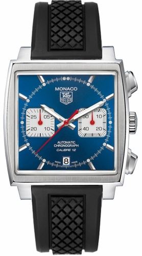 Model: CAW2111.FT6021 - CASE = [Material:Brushed and Polished Stainless Steel], [Case Diameter:39], [Case Thickness:16mm], [Bezel:Fixed], [Case Back:See-thru Sapphire crystal], [Water Resistant:100 Meters - 330 Feet], [Crystal:Scratch Resistant Sapphire], DIAL = [Color:Blue Chronograph], MOVEMENT = [Type:Automatic Self Winding Calibre 12], [Crown:Winding], BAND = [Clasp:Deployment Buckle], [Type:Black Rubber], (In Stock - Ready to ship.)