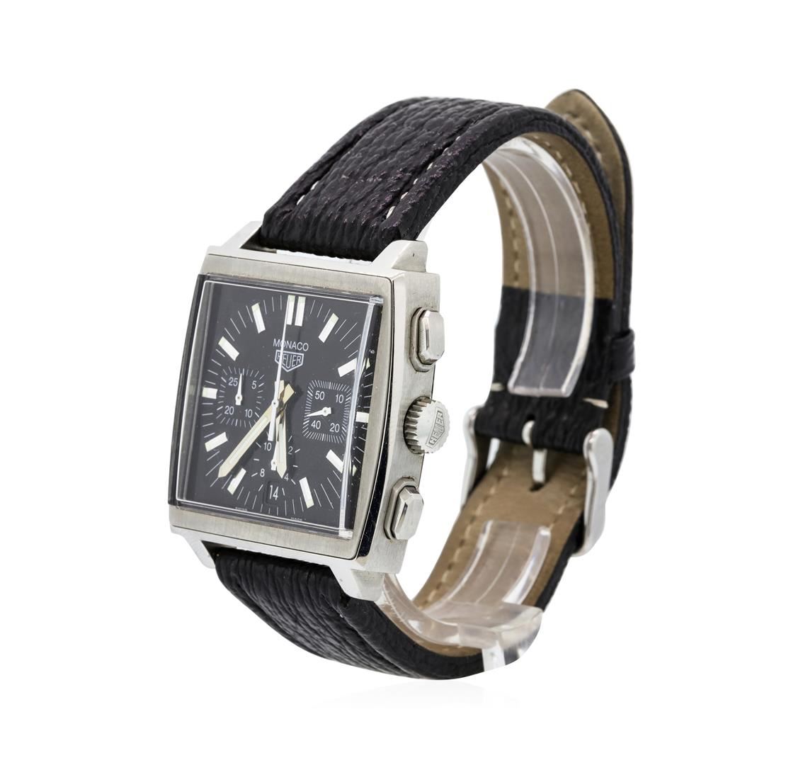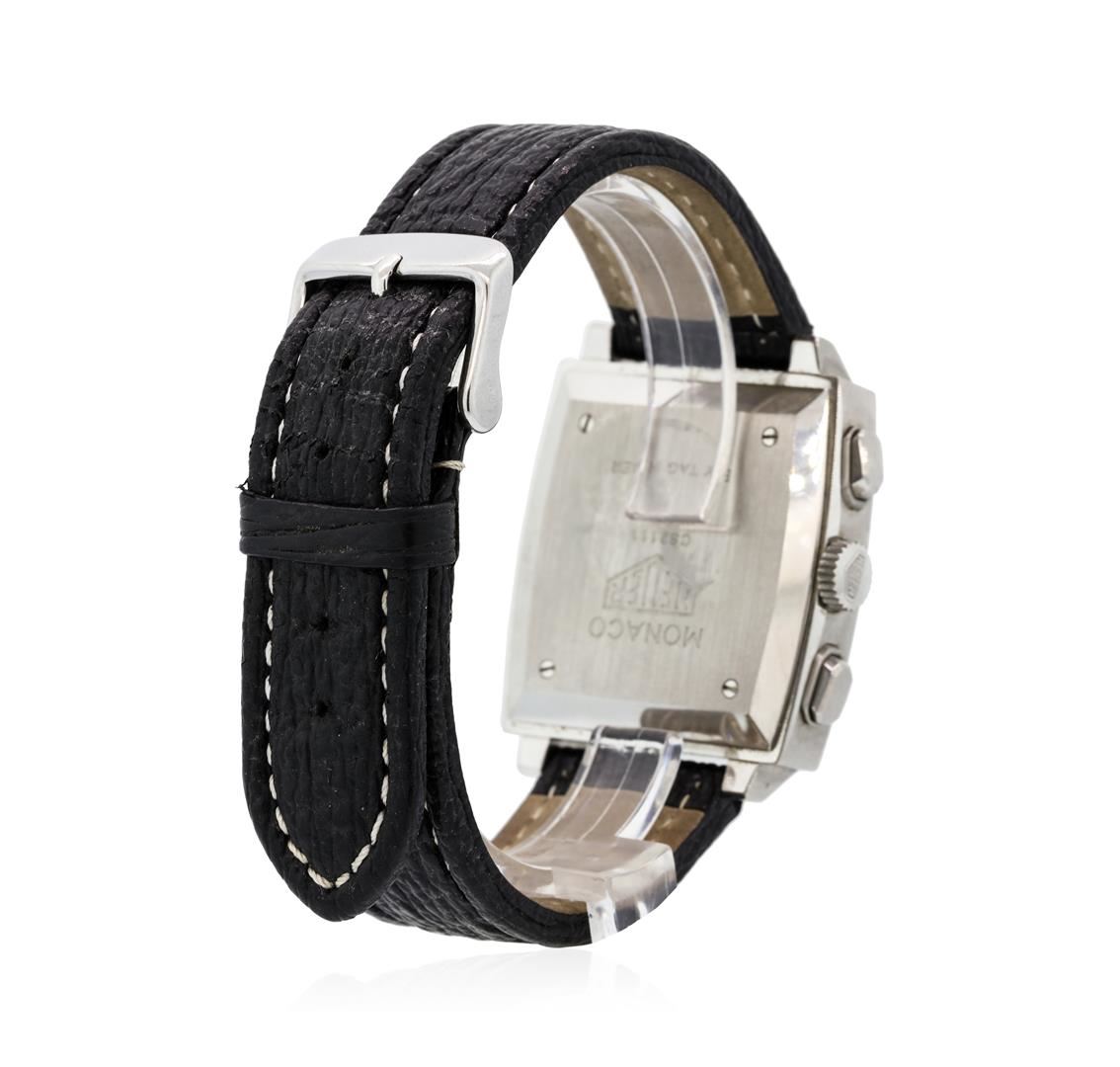 One Tag Heuer Monaco Wristwatch with a black dial with luminescent hands, raised silver index hour markers, subsidiary second hand, date indicator, chronograph functions with a black sharkskin strap. Style number CS2111, serial number 02092.