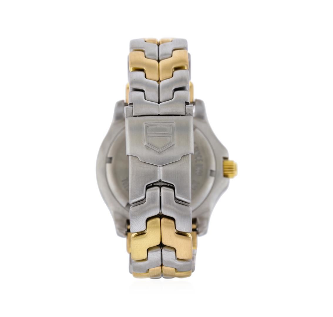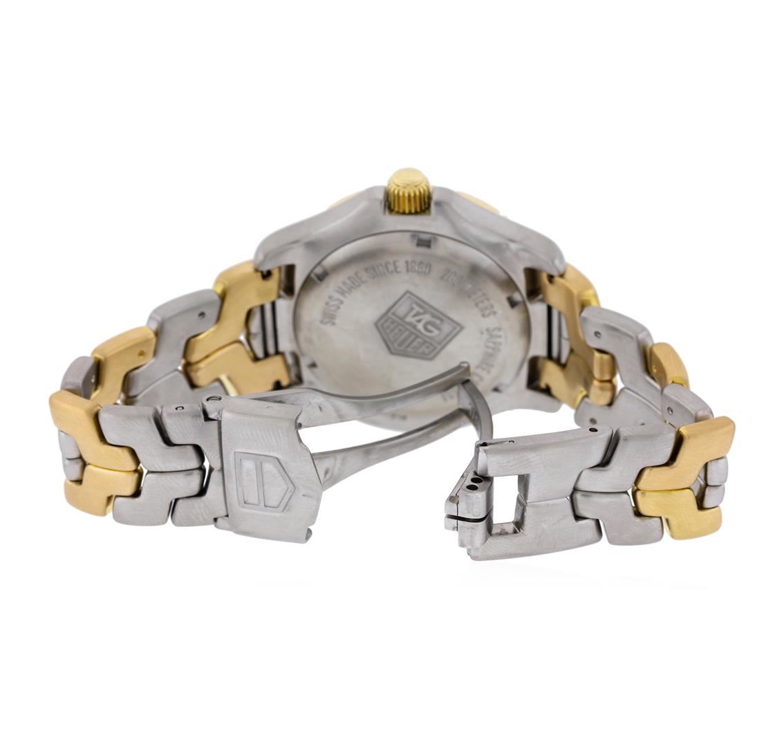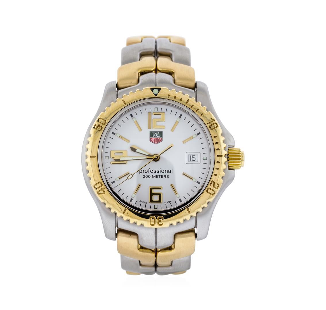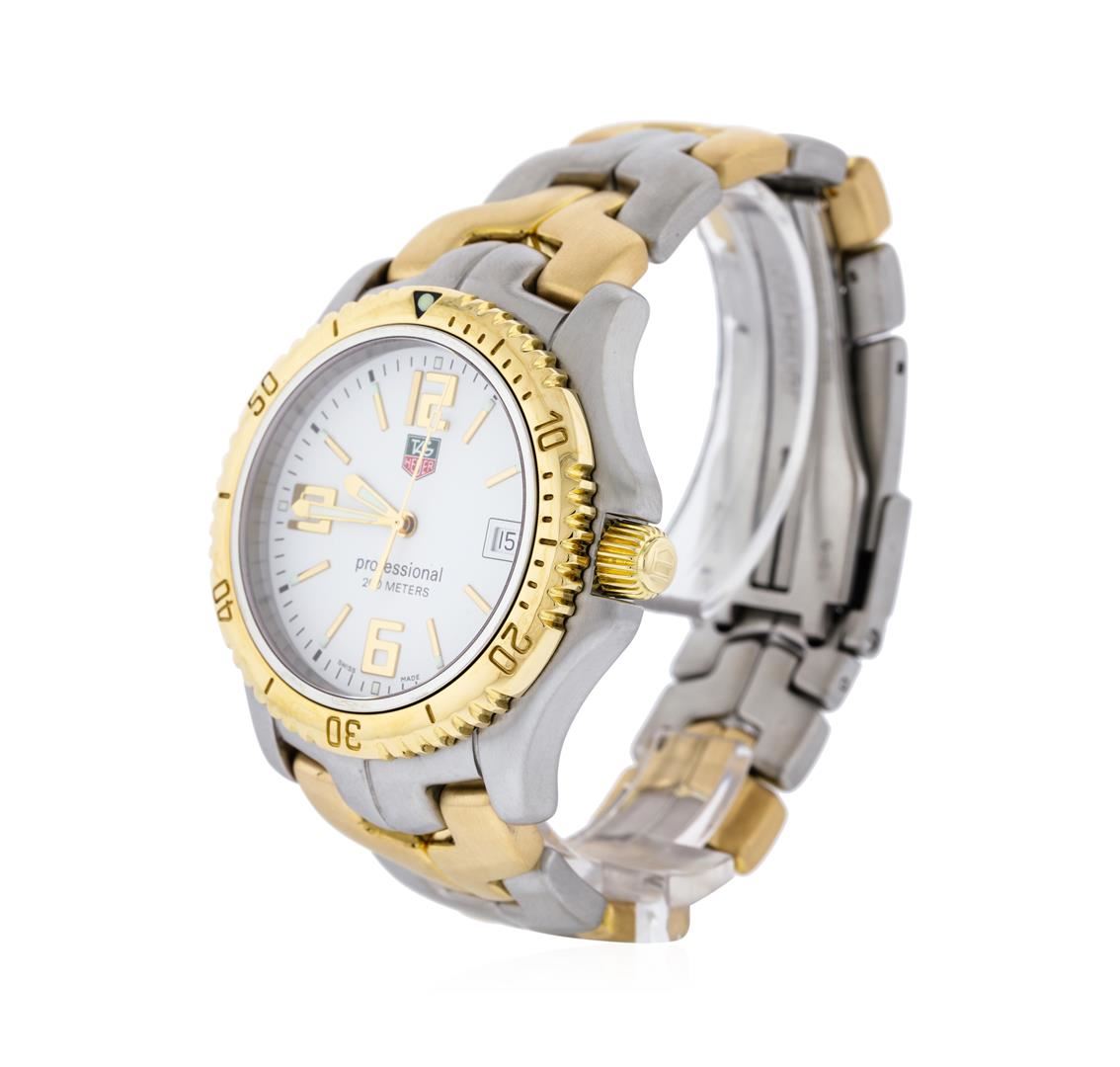 One Tag Heuer Two Tone Pro men's watch: Case: Stainless steel. Bezel: Gold plated stainless steel. Crown: Gold plated steel with logo; screw lock. Crystal: Sapphire. Dial: White; date window located at the 3 o'clock position; luminous gold tone hands. Bracelet: Gold plated/stainless steel.