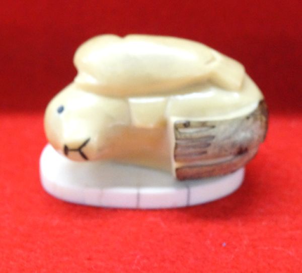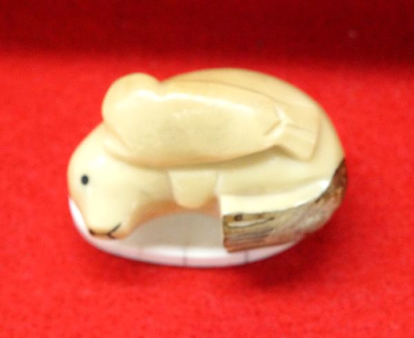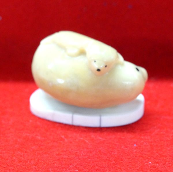 From the Tucson, Arizona Collection. Northwest Coast Tagua Nut Seal & Pup Carving atop Bone Ivory Base, seal measures 1.75''L x 1.25''W x .75''H, base measures 1 5/8''L x 1 1/16''W and is hallmarked LS, sweet carving, recently the tagua nut has been making a comeback because of the near extinction of animal ivory and the present ban on animal ivory.