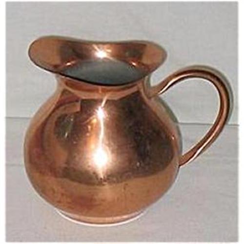 This lovely copper water pitcher is marked Tagus/Made in Portugal/R-49. It is in very good condition with 1 ding in the side and some scratches. In need of a good polishing it measures 6 3/4 inches tall and 4 inches at the base.<BR>SH & Ins. will be quoted after orders placed. If you have any questions please contact me and thank you for looking.