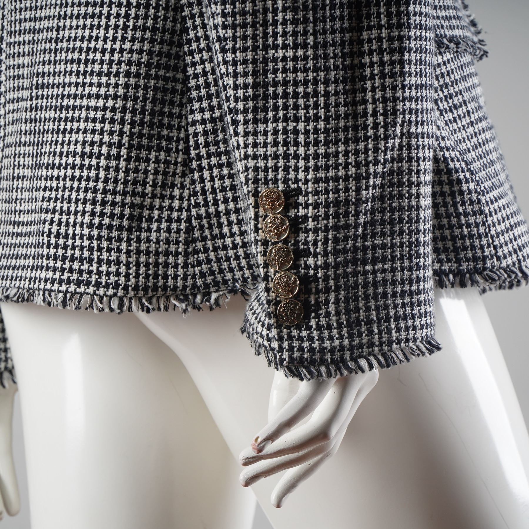 Step into timeless sophistication with this impeccably tailored Elie Tahari blazer, crafted in a striking black and white houndstooth weave. The structured silhouette features a sharp, double-breasted front adorned with gleaming gold-tone crest buttons that add a regal edge to its classic lines. Fringed edges at the hem and cuffs lend a modern twist to the heritage pattern, while flap pockets and strong shoulder seams reinforce the blazer's polished appeal. A statement piece perfect for elevating professional looks or pairing with denim for chic, off-duty style. Size 12.