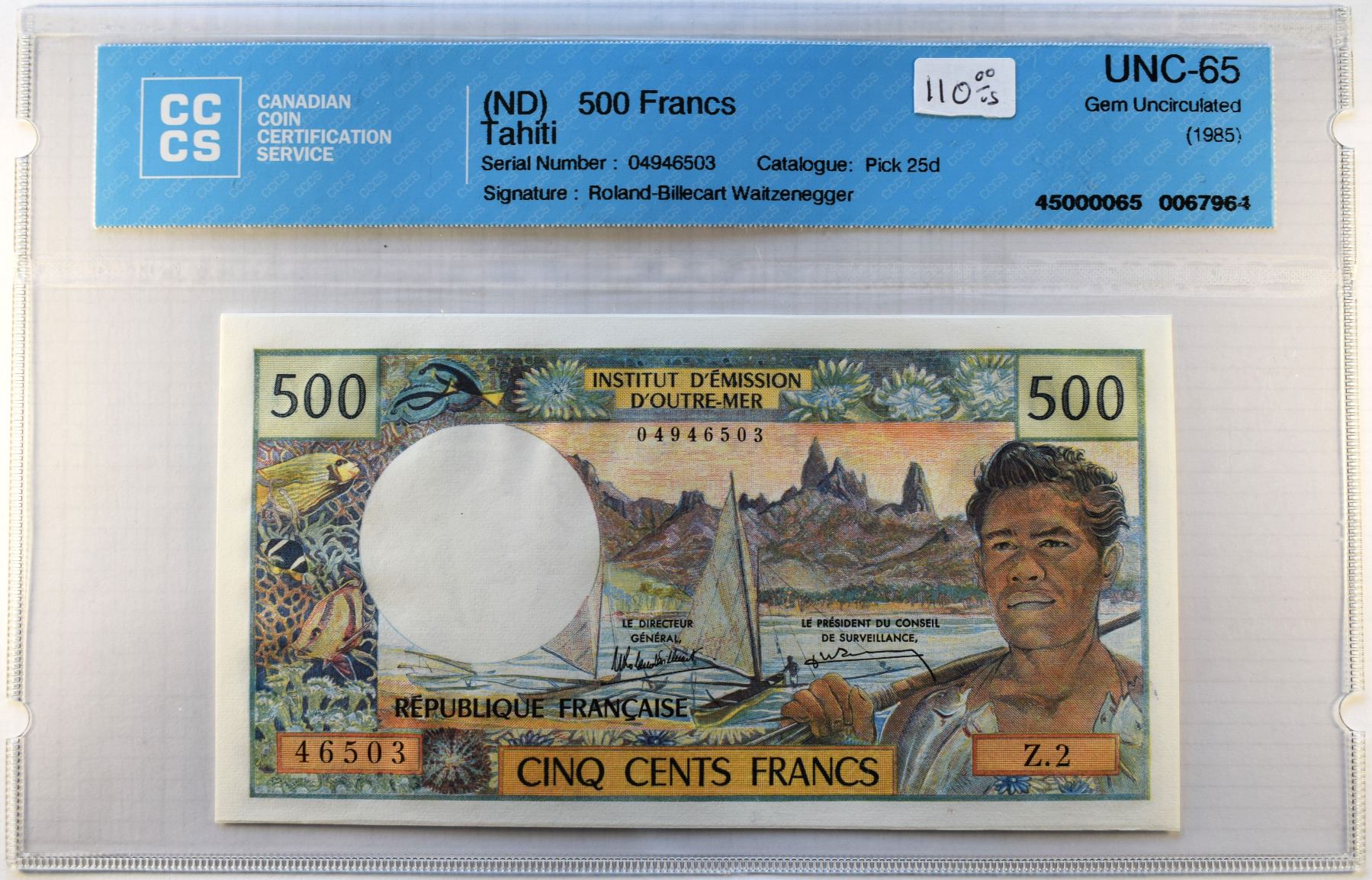 Tahiti, 500 Francs ND (1985) Pick 25d Gem UNC-65 Certified CCCS