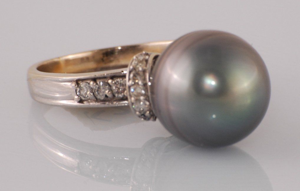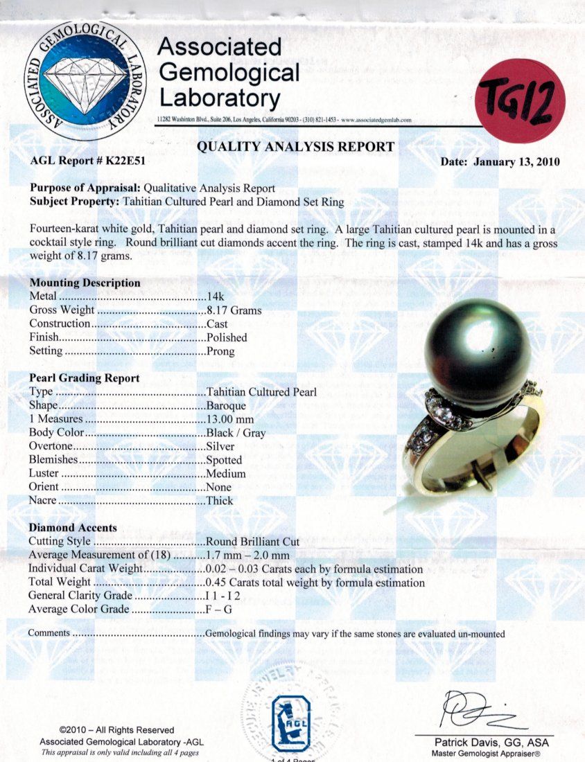 14K White gold, Tahitian pearl (13mm) and diamond (0.45ct) set ring. A large Tahitian cultured pearl is mounted in a cocktail style ring. Round brilliant cut diamonds accent the ring. The ring is cast, stamped 14K and has a gross weight of 8.17 grams.