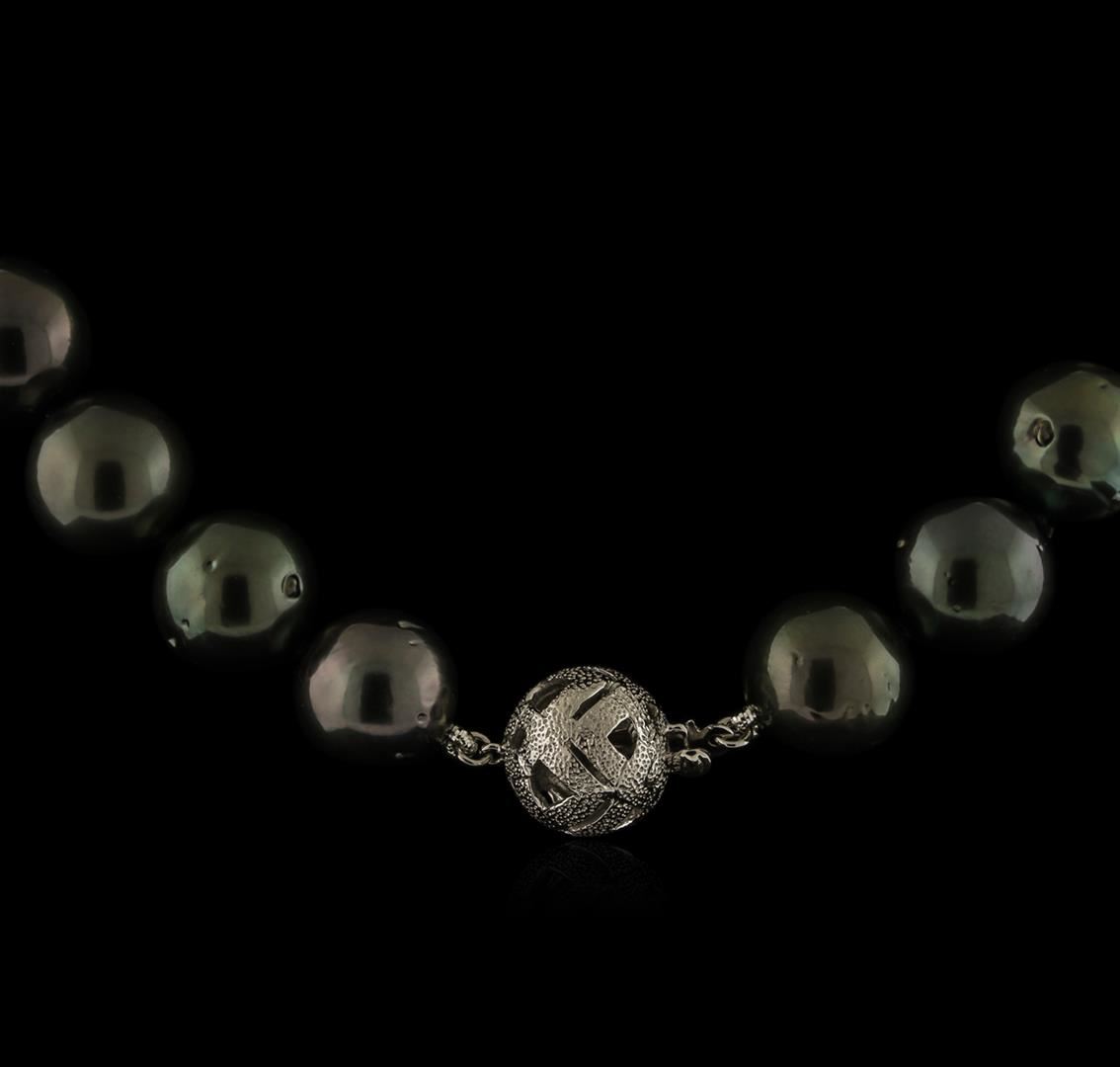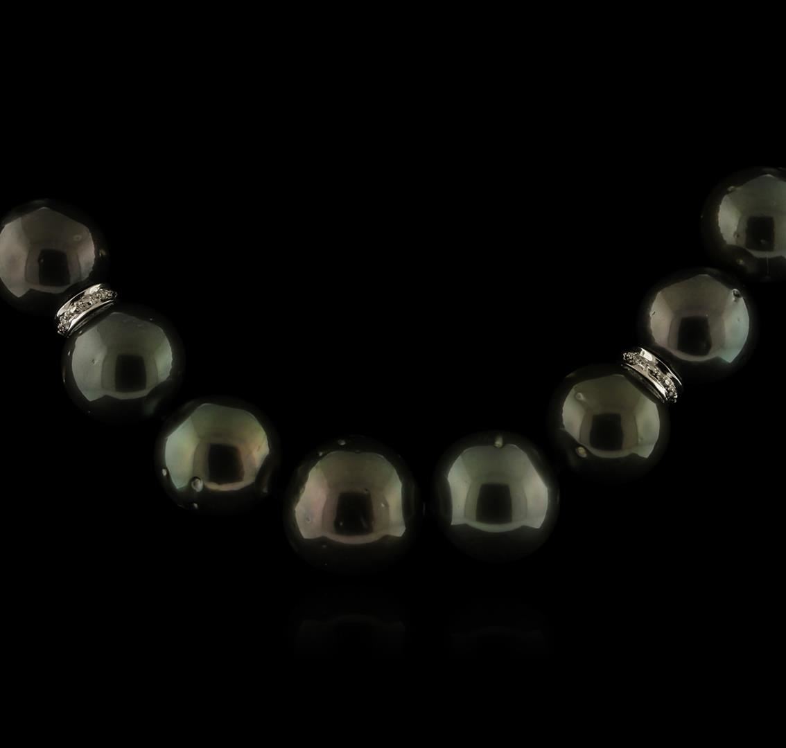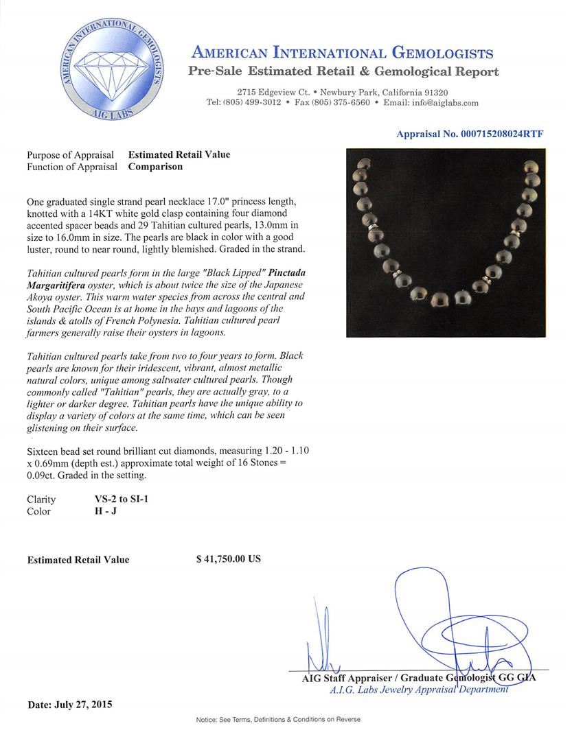 One graduated single strand pearl necklace 17.0" princess length, knotted with a 14KT white gold clasp containing 29 Tahitian pearls, 13.0mm in size to 16.0mm in size. The pearls are black in color with a good luster, round to near round, lightly blemished Graded in the strand. Tahitian cultured pearls form in the large "Black Lipped" Pinctada Margaritifera oyster, which is about twice the size of the Japanese Akoya oyster. This warm water species from across the central and South Pacific Ocean is at home in the bays and lagoons of the islands & atolls of French Polynesia. Tahitian cultured pearl farmers generally raise their oysters in lagoons. Tahitian cultured pearls take from two to four years to form. Black pearls are known for their iridescent, vibrant, almost metallic natural colors, unique among saltwater cultured pearls. Though commonly called "Tahitian" pearls, they are actually gray, to a lighter or darker degree. Tahitian pearls have the unique ability to display a variety of colors at the same time, which can be seen glistening on their surface. Sixteen bead set round brilliant cut diamonds, measuring 1.20 - 1.10 x 0.69mm (depth est.) approximate total weight of 16 Stones = 0.09ct. Graded in the setting. Clarity: VS-2 to SI-1. Color: H - J. AIG Appraised at $41,750.00.