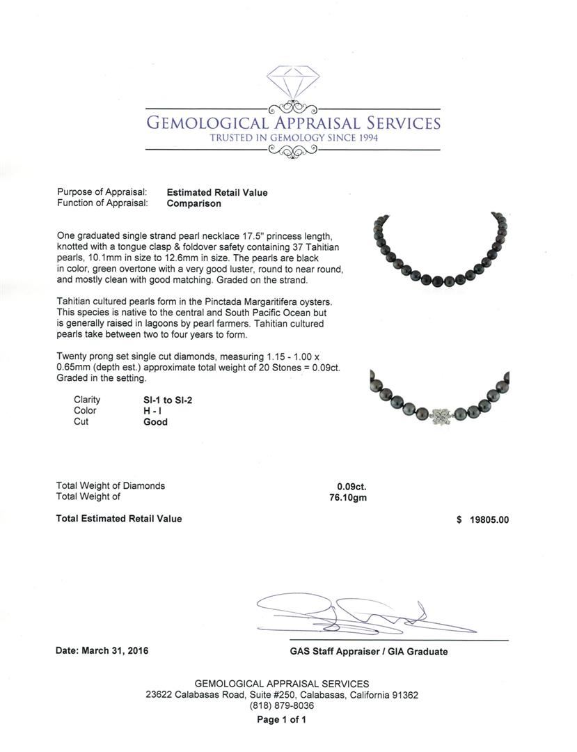 One graduated single strand pearl necklace 17.5" princess length, knotted with a tongue clasp & foldover safety containing 37 Tahitian pearls, 10.1mm in size to 12.6mm in size. The pearls are black in color, green overtone with a very good luster, round to near round, and mostly clean with good matching. Graded on the strand. Tahitian cultured pearls form in the Pinctada Margaritifera oysters. This species is native to the central and South Pacific Ocean but is generally raised in lagoons by pearl farmers. Tahitian cultured pearls take between two to four years to form. Twenty prong set single cut diamonds, measuring 1.15 - 1.00 x 0.65mm (depth est.) approximate total weight of 20 Stones = 0.09ct. Graded in the setting. Clarity: SI-1 to SI-2. Color: H - I. Cut Good. Total Weight of Diamonds 0.09ct. Total Weight of 76.10gm GAS Appraised at $19,805.00.
