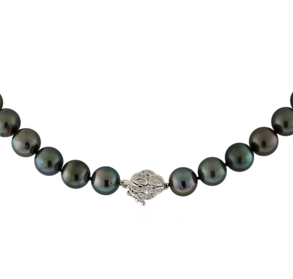 One graduated single strand pearl necklace 18.0" princess length, knotted with a tongue clasp & foldover safety containing 37 Tahitian pearls, 10.1mm in size to 13.1mm in size. The pearls are black in color, green overtone with a very good luster, round to near round, and mostly clean with good matching. Graded on the strand. Tahitian cultured pearls form in the Pinctada Margaritifera oysters. This species is native to the central and South Pacific Ocean but is generally raised in lagoons by pearl farmers. Tahitian cultured pearls take between two to four years to form. Twenty-Four prong set single cut diamonds, measuring 1.15 - 1.00 x 0.65mm (depth est.) approximate total weight of 24 Stones = 0.11ct. Graded in the setting. Clarity: SI-1 to SI-2. Color: G - Good. Total Weight of Diamonds 0.11ct. Total Weight of 76.20gm GAS Appraised at $20,395.00.