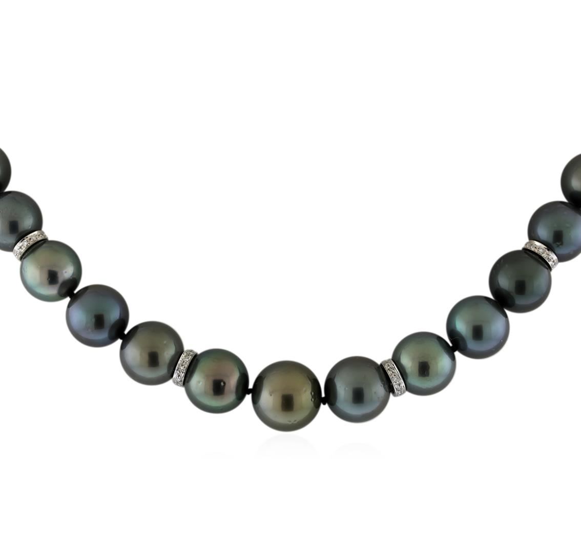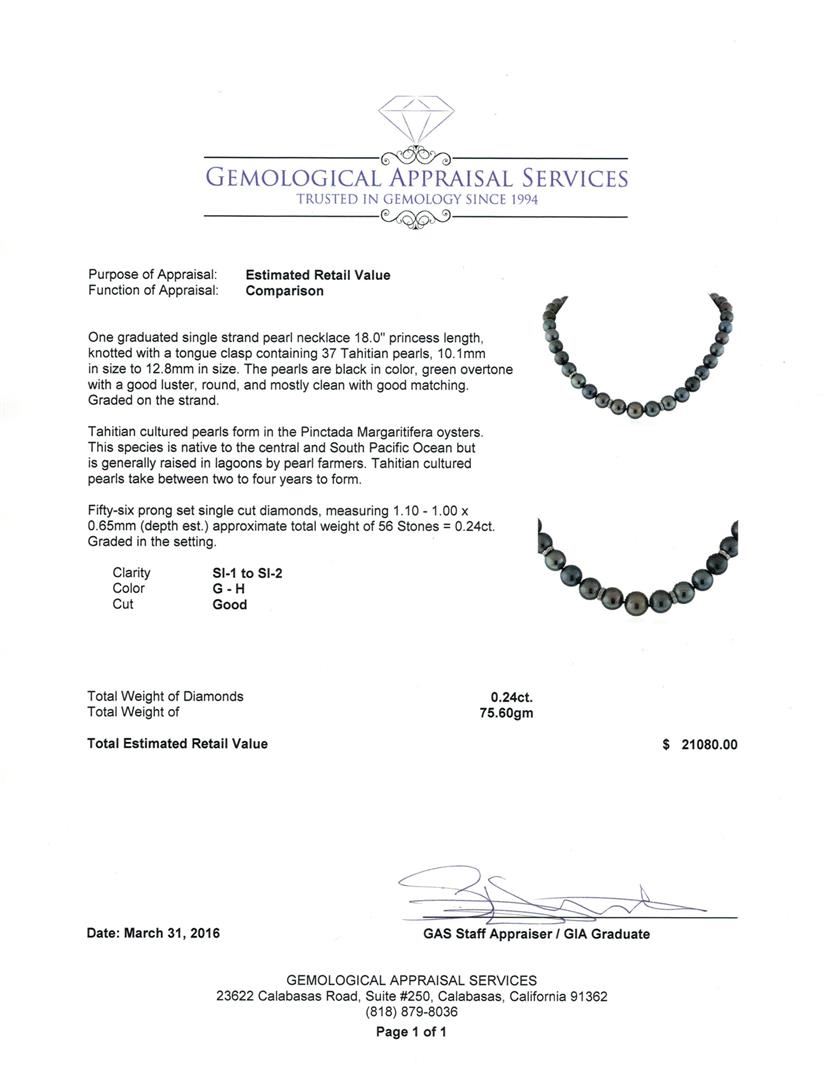 One graduated single strand pearl necklace 18.0" princess length, knotted with a tongue clasp containing 37 Tahitian pearls, 10.1mm in size to 12.8mm in size. The pearls are black in color, green overtone with a good luster, round, and mostly clean with good matching. Graded on the strand. Tahitian cultured pearls form in the Pinctada Margaritifera oysters. This species is native to the central and South Pacific Ocean but is generally raised in lagoons by pearl farmers. Tahitian cultured pearls take between two to four years to form. Fifty-Six prong set single cut diamonds, measuring 1.10 - 1.00 x 0.65mm (depth est.) approximate total weight of 56 Stones = 0.24ct. Graded in the setting. Clarity: SI-1 to SI-2. Color: G - Good. Total Weight of Diamonds 0.24ct. Total Weight of 75.60gm GAS Appraised at $21,080.00.