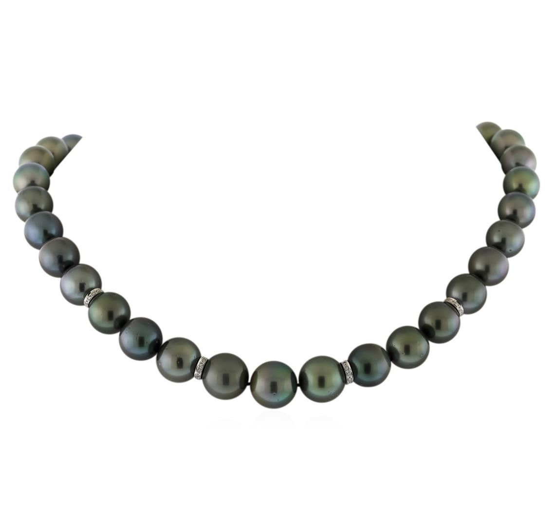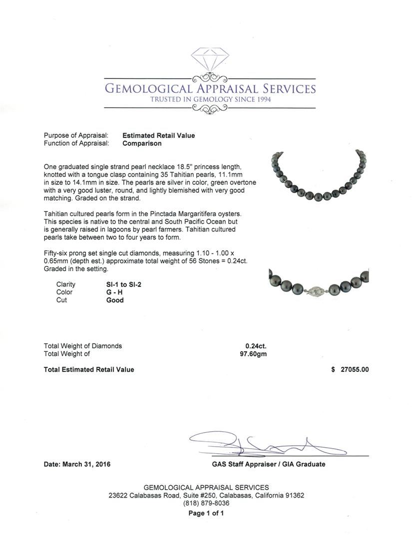 One graduated single strand pearl necklace 18.5" princess length, knotted with a tongue clasp containing 35 Tahitian pearls, 11.1mm in size to 14.1mm in size. The pearls are silver in color, green overtone with a very good luster, round, and lightly blemished with very good matching. Graded on the strand. Tahitian cultured pearls form in the Pinctada Margaritifera oysters. This species is native to the central and South Pacific Ocean but is generally raised in lagoons by pearl farmers. Tahitian cultured pearls take between two to four years to form. Fifty-Six prong set single cut diamonds, measuring 1.10 - 1.00 x 0.65mm (depth est.) approximate total weight of 56 Stones = 0.24ct. Graded in the setting. Clarity: SI-1 to SI-2. Color: G - Good. Total Weight of Diamonds 0.24ct. Total Weight of 97.60gm GAS Appraised at $27,055.00.