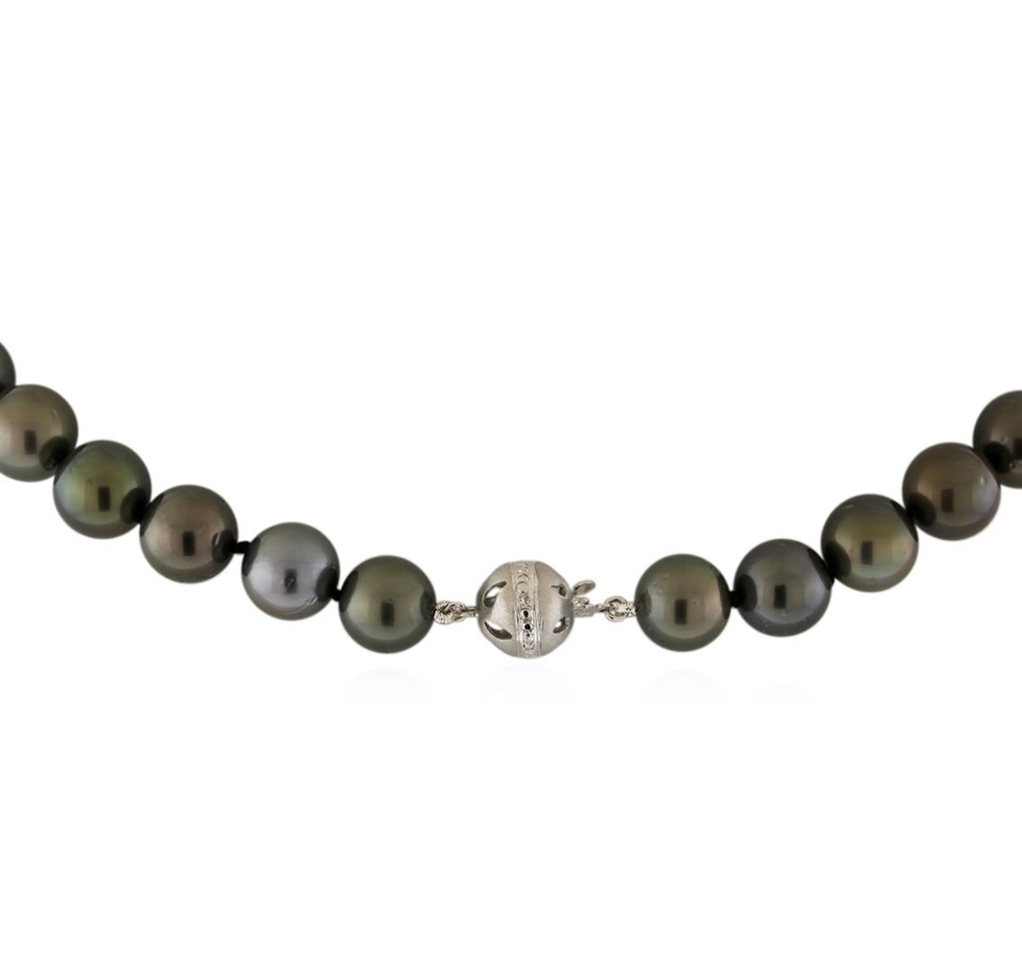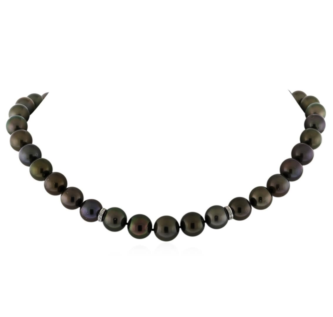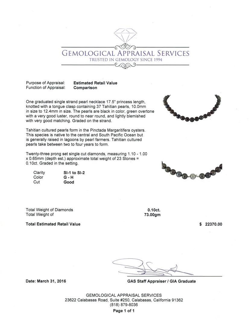 One graduated single strand pearl necklace 17.5" princess length, knotted with a tongue clasp containing 37 Tahitian pearls, 10.0mm in size to 12.4mm in size. The pearls are black in color, green overtone with a very good luster, round to near round, and lightly blemished with very good matching. Graded on the strand. Tahitian cultured pearls form in the Pinctada Margaritifera oysters. This species is native to the central and South Pacific Ocean but is generally raised in lagoons by pearl farmers. Tahitian cultured pearls take between two to four years to form. Twenty-Three prong set single cut diamonds, measuring 1.10 - 1.00 x 0.65mm (depth est.) approximate total weight of 23 Stones = 0.10ct. Graded in the setting. Clarity: SI-1 to SI-2. Color: G - Good. Total Weight of Diamonds 0.10ct. Total Weight of 73.00gm GAS Appraised at $22,370.00.