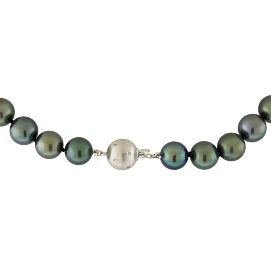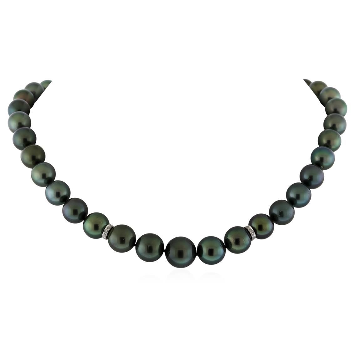 One graduated single strand pearl necklace 18.0" princess length, knotted with a tongue clasp containing 37 Tahitian pearls, 10.0mm in size to 13.8mm in size. The pearls are black in color, green overtone with a good luster, round to near round, and mostly clean with good matching. Graded on the strand. Tahitian cultured pearls form in the Pinctada Margaritifera oysters. This species is native to the central and South Pacific Ocean but is generally raised in lagoons by pearl farmers. Tahitian cultured pearls take between two to four years to form. Twenty prong set single cut diamonds, measuring 1.10 - 1.00 x 0.63mm (depth est.) approximate total weight of 20 Stones = 0.08ct. Graded in the setting. Clarity: SI-1 to SI-2. Color: G - Good Ten bezel set round brilliant cut diamonds, measuring 1.20 - 1.10 x 0.69mm (depth est.) approximate total weight of 10 Stones = 0.05ct. Graded in the setting. Clarity: VS-2 to SI-2. Color: H - I. Cut Good. Total Weight of Diamonds 0.13ct. Total Weight of 75.90gm GAS Appraised at $18,345.00.