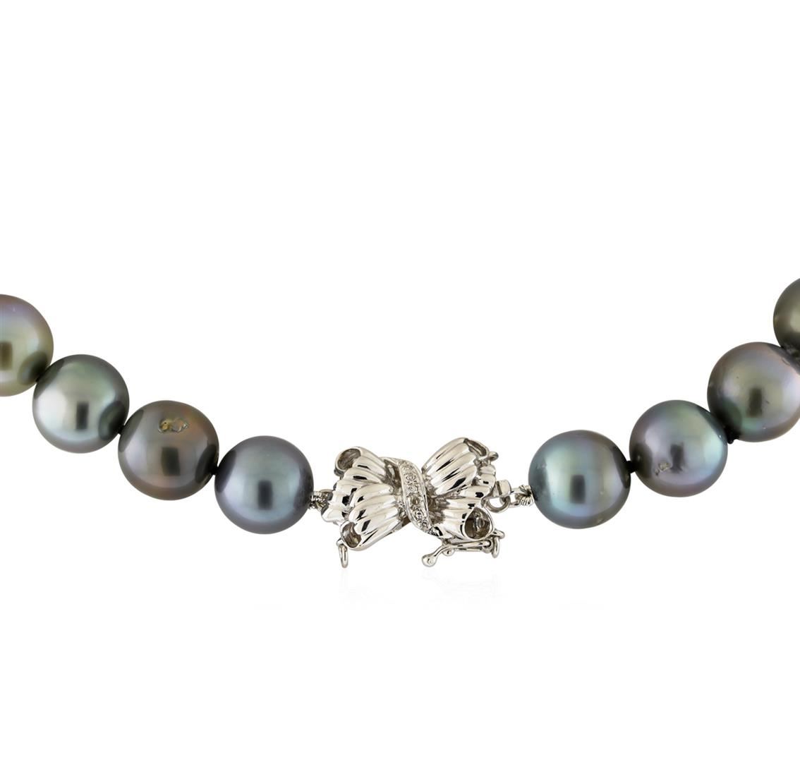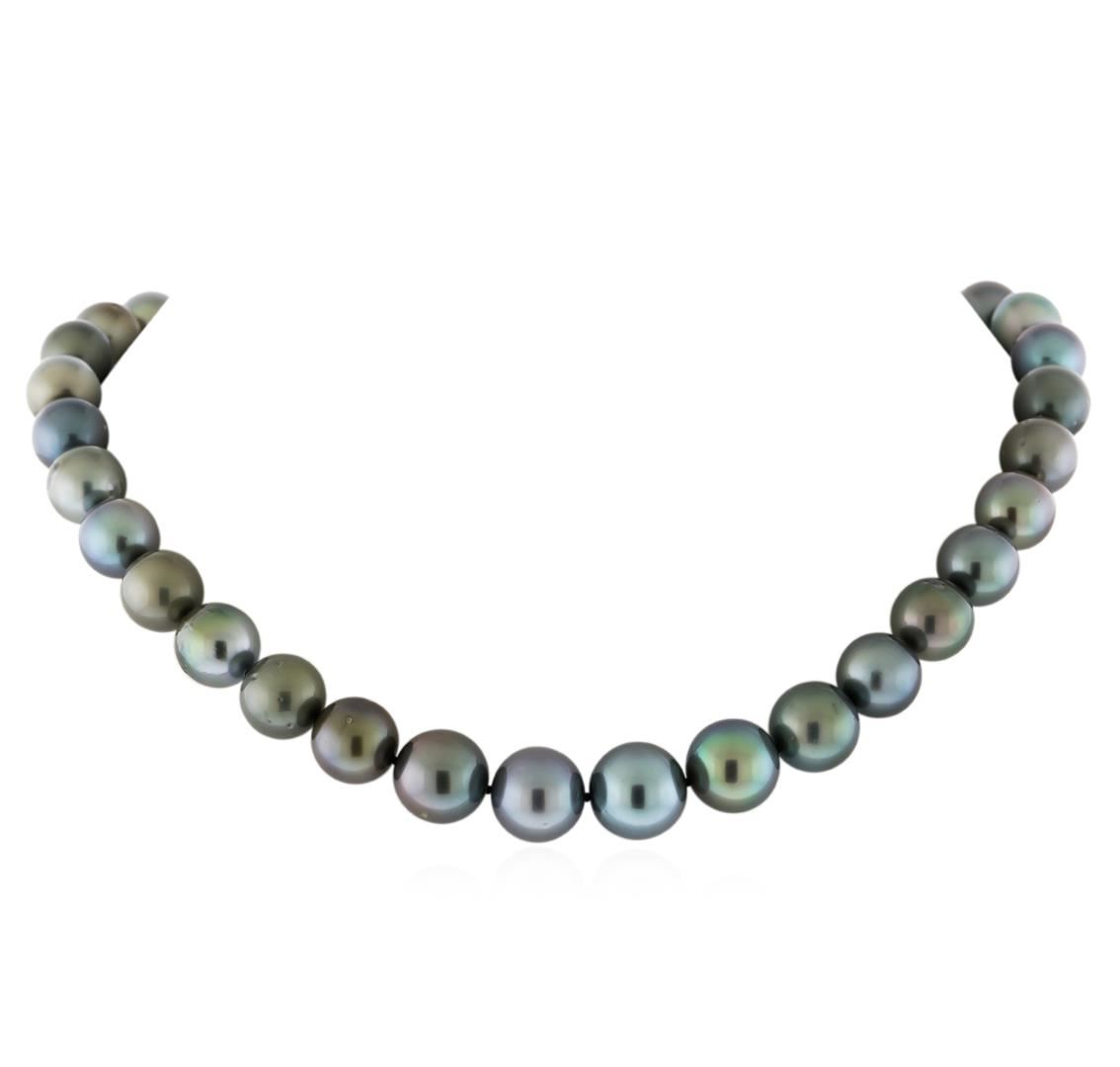 One graduated single strand pearl necklace 18.0" princess length, knotted with a tongue clasp & foldover safety containing 35 Tahitian pearls, 11.0mm in size to 14.2mm in size. The pearls are silver in color, green overtone with a good luster, round to near round, and lightly blemished with good matching. Graded on the strand. Tahitian cultured pearls form in the Pinctada Margaritifera oysters. This species is native to the central and South Pacific Ocean but is generally raised in lagoons by pearl farmers. Tahitian cultured pearls take between two to four years to form. Seven prong set single cut diamonds, measuring 1.00 - 0.95 x 0.59mm (depth est.) approximate total weight of 7 Stones = 0.02ct. Graded in the setting. Clarity: SI-1 to SI-2. Color: G - Good. Total Weight of Diamonds 0.02ct. Total Weight of 95.30gm GAS Appraised at $14,080.00.