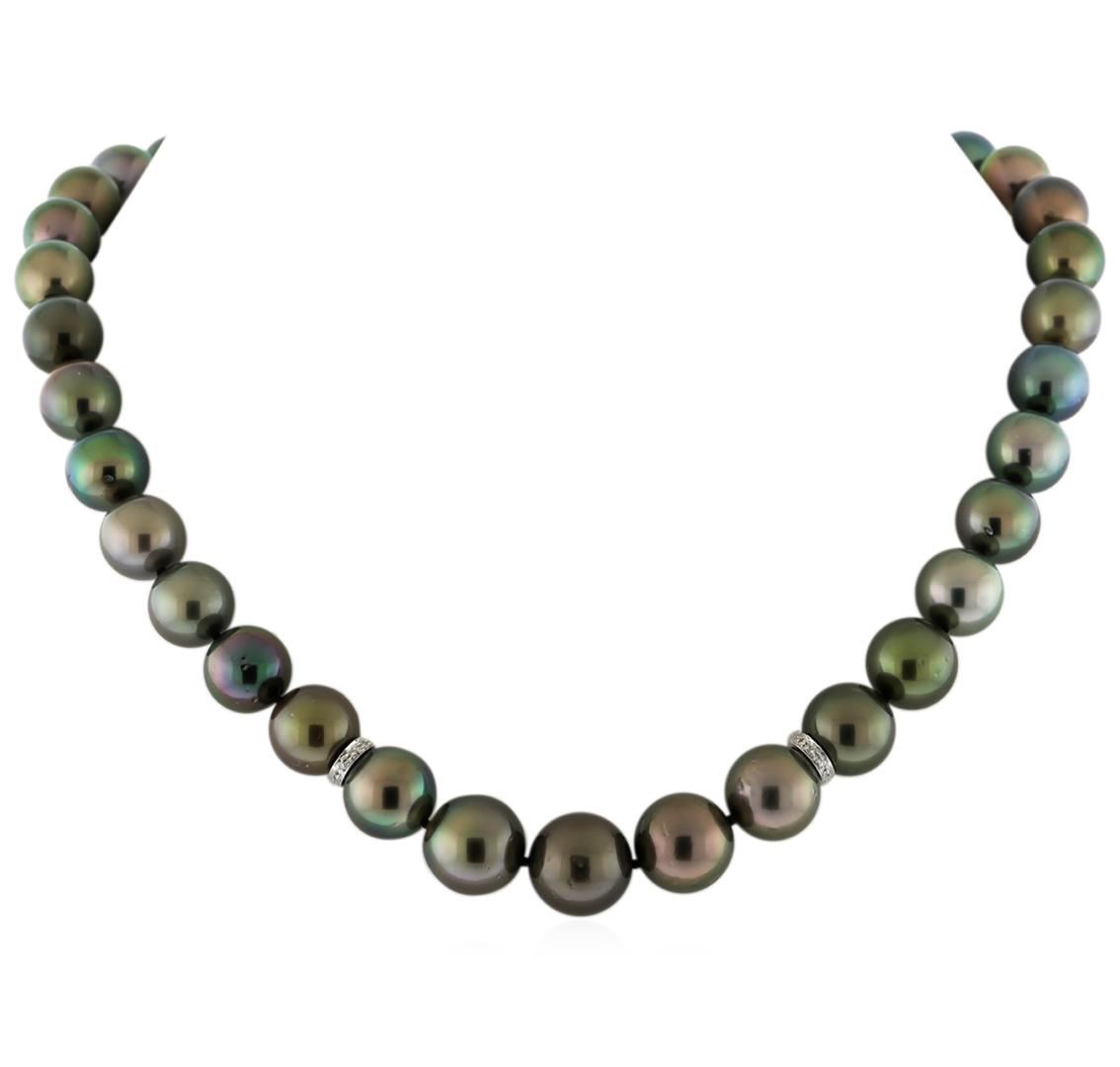 One graduated single strand pearl necklace 18.0" princess length, knotted with a tongue clasp containing 37 Tahitian pearls, 10.0mm in size to 13.1mm in size. The pearls are black in color, green overtone with a very good luster, round to near round, and lightly blemished with good matching. Graded on the strand. Tahitian cultured pearls form in the Pinctada Margaritifera oysters. This species is native to the central and South Pacific Ocean but is generally raised in lagoons by pearl farmers. Tahitian cultured pearls take between two to four years to form. Thirteen prong set single cut diamonds, measuring 1.30 - 1.20 x 0.78mm (depth est.) approximate total weight of 13 Stones = 0.10ct. Graded in the setting. Clarity: SI-1 to SI-2. Color: H - I. Cut Good Twenty prong set single cut diamonds, measuring 1.10 - 1.00 x 0.63mm (depth est.) approximate total weight of 20 Stones = 0.08ct. Graded in the setting. Clarity: SI-1 to SI-2. Color: H - I. Cut Good. Total Weight of Diamonds 0.18ct. Total Weight of 73.70gm GAS Appraised at $18,230.00.