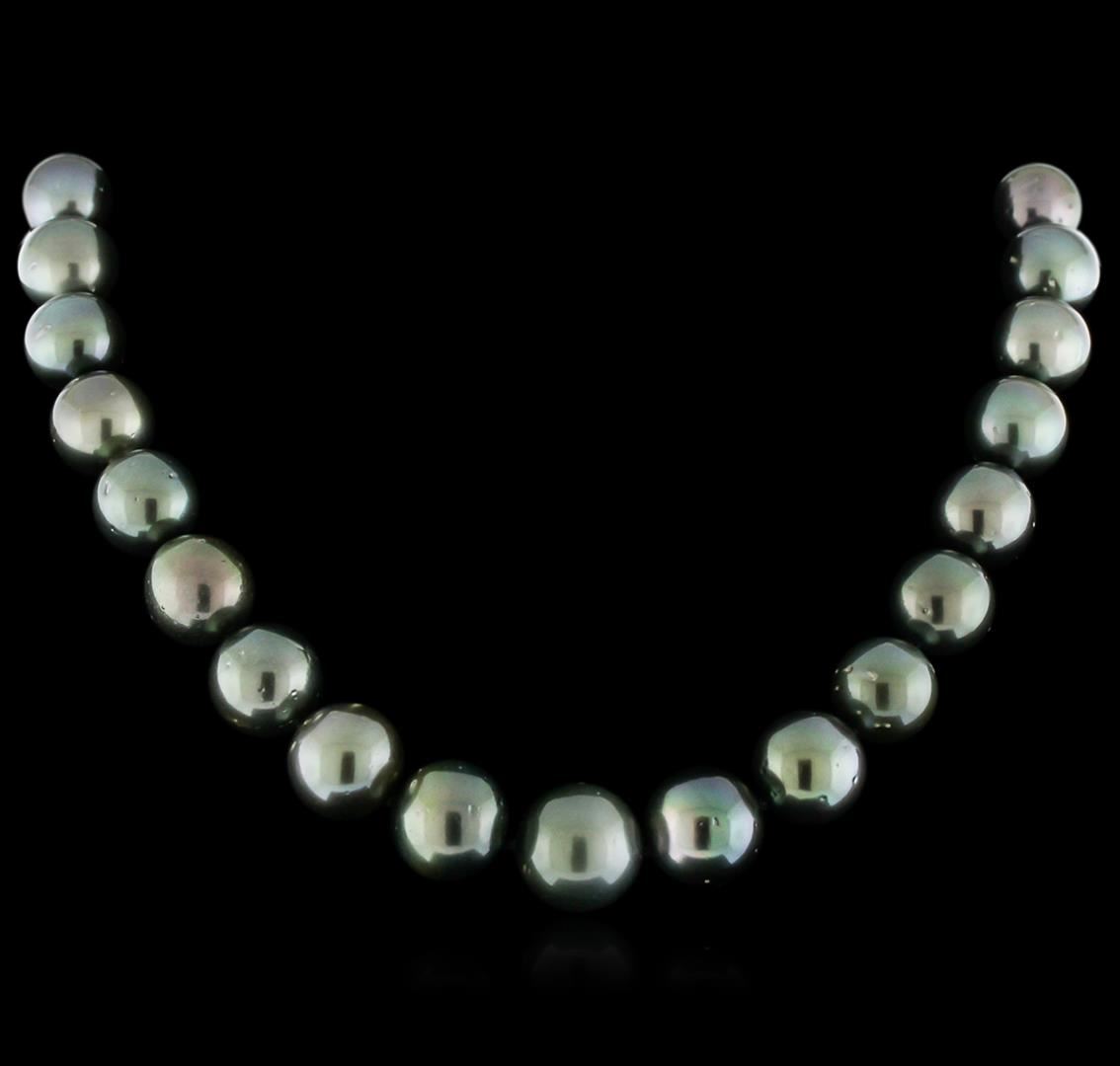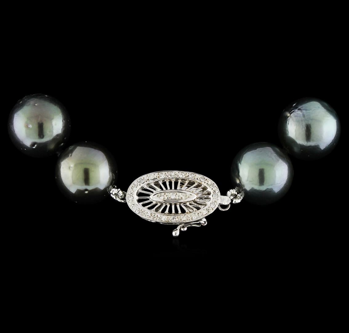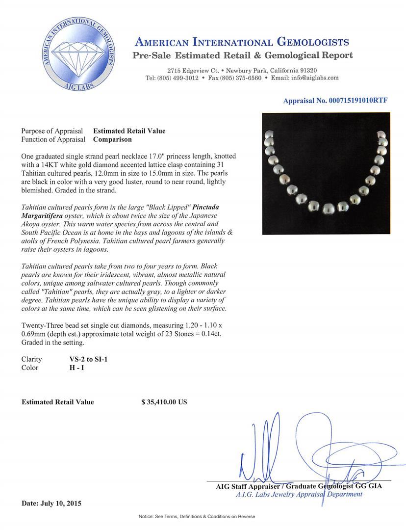One graduated single strand pearl necklace 17.0" princess length, knotted with a 14KT white gold clasp containing 31 Tahitian pearls, 12.0mm in size to 15.0mm in size. The pearls are black in color with a very good luster, round to near round, lightly blemished Graded in the strand. Tahitian cultured pearls form in the large "Black Lipped" Pinctada Margaritifera oyster, which is about twice the size of the Japanese Akoya oyster. This warm water species from across the central and South Pacific Ocean is at home in the bays and lagoons of the islands & atolls of French Polynesia. Tahitian cultured pearl farmers generally raise their oysters in lagoons. Tahitian cultured pearls take from two to four years to form. Black pearls are known for their iridescent, vibrant, almost metallic natural colors, unique among saltwater cultured pearls. Though commonly called "Tahitian" pearls, they are actually gray, to a lighter or darker degree. Tahitian pearls have the unique ability to display a variety of colors at the same time, which can be seen glistening on their surface. Twenty-Three bead set single cut diamonds, measuring 1.20 - 1.10 x 0.69mm (depth est.) approximate total weight of 23 Stones = 0.14ct. Graded in the setting. Clarity: VS-2 to SI-1. Color: H - I. AIG Appraised at $35,410.00.