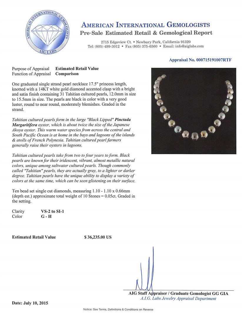 One graduated single strand pearl necklace 17.5" princess length, knotted with a 14KT white gold clasp containing 31 Tahitian pearls, 12.0mm in size to 15.5mm in size. The pearls are black in color with a very good luster, round to near round, moderately blemished Graded in the strand. Tahitian cultured pearls form in the large "Black Lipped" Pinctada Margaritifera oyster, which is about twice the size of the Japanese Akoya oyster. This warm water species from across the central and South Pacific Ocean is at home in the bays and lagoons of the islands & atolls of French Polynesia. Tahitian cultured pearl farmers generally raise their oysters in lagoons. Tahitian cultured pearls take from two to four years to form. Black pearls are known for their iridescent, vibrant, almost metallic natural colors, unique among saltwater cultured pearls. Though commonly called "Tahitian" pearls, they are actually gray, to a lighter or darker degree. Tahitian pearls have the unique ability to display a variety of colors at the same time, which can be seen glistening on their surface. Ten bead set single cut diamonds, measuring 1.10 - 1.10 x 0.66mm (depth est.) approximate total weight of 10 Stones = 0.05ct. Graded in the setting. Clarity: VS-2 to SI-1. Color: G - H. AIG Appraised at $36,235.00.
