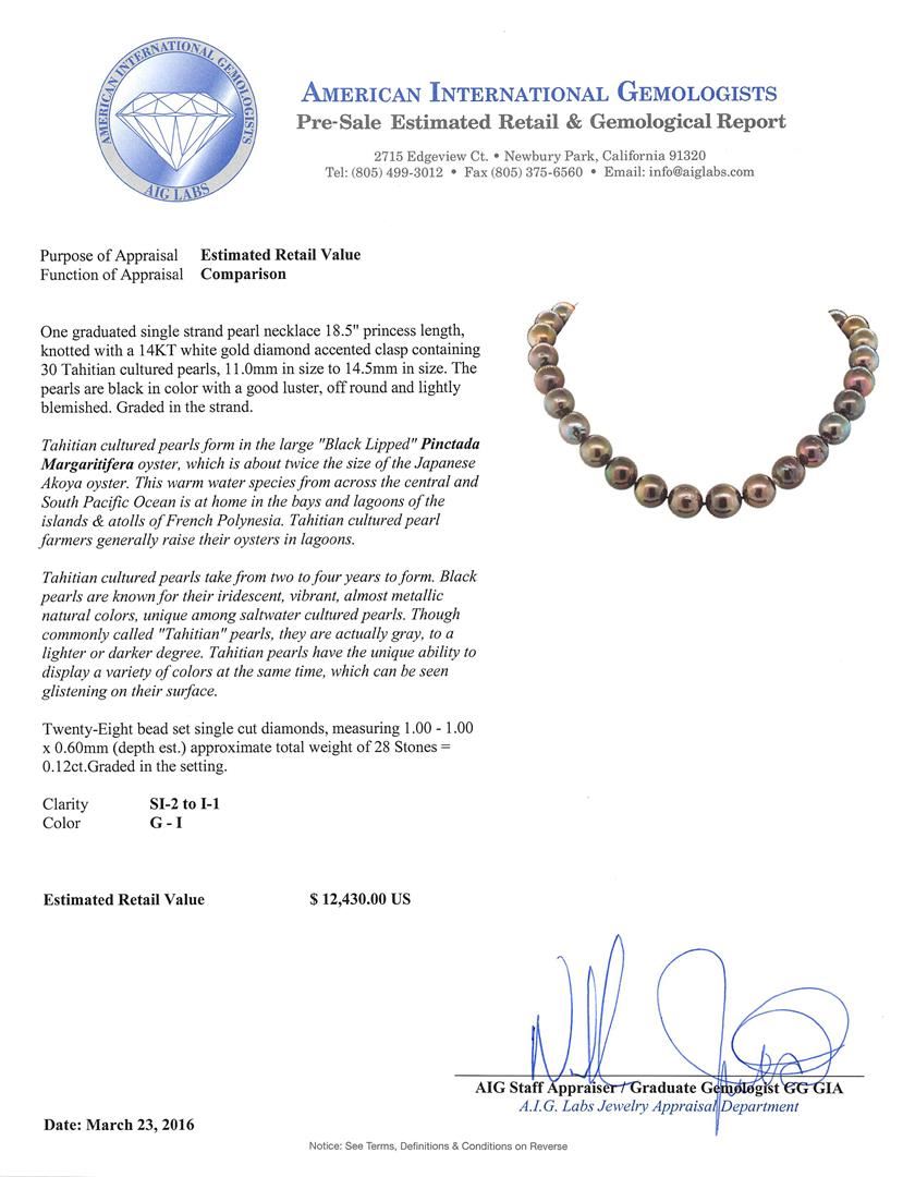 One graduated single strand pearl necklace 18.5" princess length, knotted with a 14KT white gold diamond accent clasp containing 30 Tahitian pearls, 11.0mm in size to 14.5mm in size. The pearls are black in color with a good luster, off round, lightly blemished Graded in the strand. Tahitian cultured pearls form in the large "Black Lipped" Pinctada Margaritifera oyster, which is about twice the size of the Japanese Akoya oyster. This warm water species from across the central and South Pacific Ocean is at home in the bays and lagoons of the islands & atolls of French Polynesia. Tahitian cultured pearl farmers generally raise their oysters in lagoons. Tahitian cultured pearls take from two to four years to form. Black pearls are known for their iridescent, vibrant, almost metallic natural colors, unique among saltwater cultured pearls. Though commonly called "Tahitian" pearls, they are actually gray, to a lighter or darker degree. Tahitian pearls have the unique ability to display a variety of colors at the same time, which can be seen glistening on their surface. Twenty-Eight bead set single cut diamonds, measuring 1.00 - 1.00 x 0.60mm (depth est.) approximate total weight of 28 Stones = 0.12ct. Graded in the setting. Clarity: SI-2 to I-1. Color: G - I. AIG Appraised at $12,430.00.