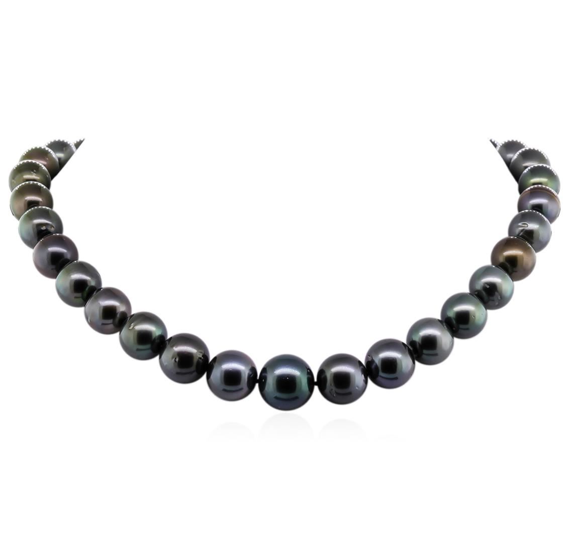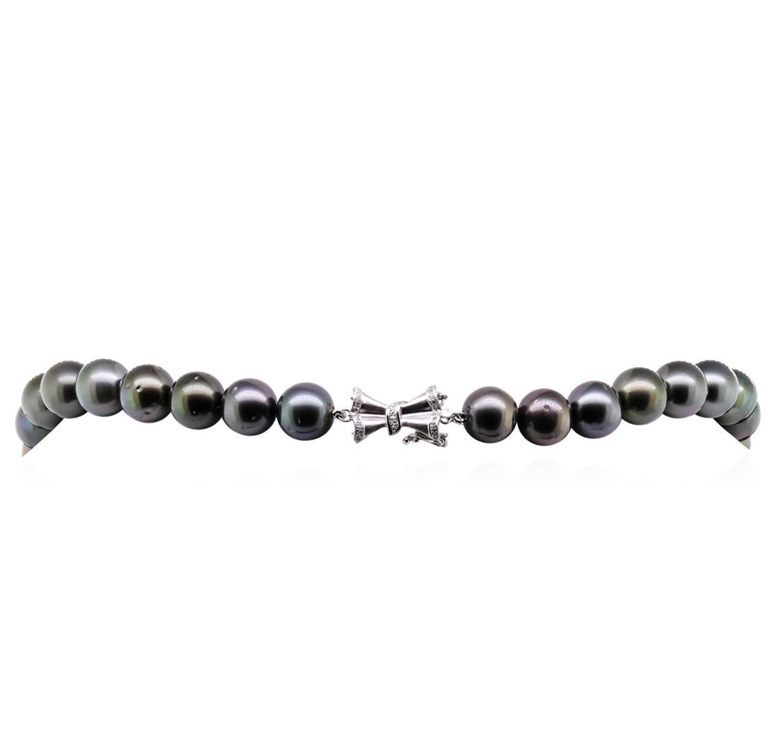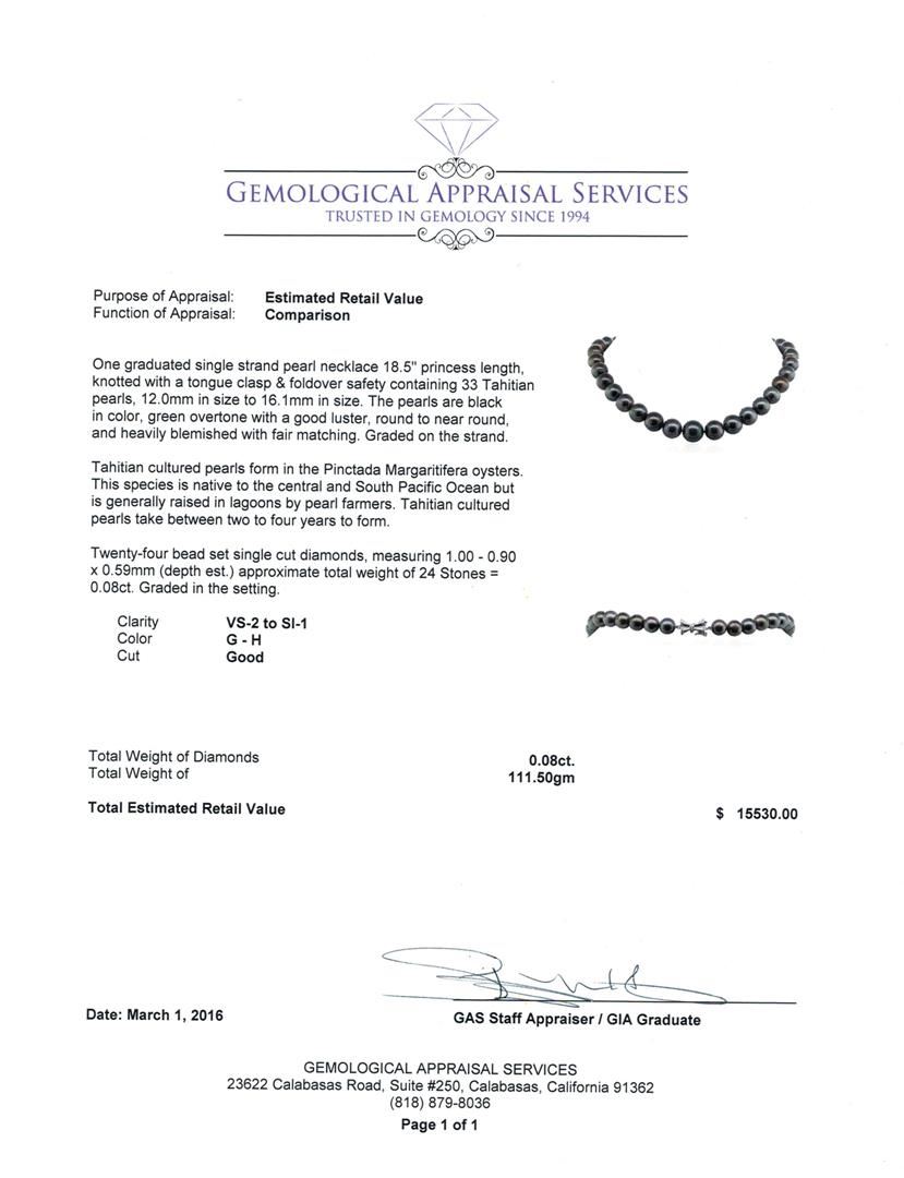 One graduated single strand pearl necklace 18.5" princess length, knotted with a tongue clasp & foldover safety containing 33 Tahitian pearls, 12.0mm in size to 16.1mm in size. The pearls are black in color, green overtone with a good luster, round to near round, and heavily blemished with fair matching. Graded on the strand. Tahitian cultured pearls form in the Pinctada Margaritifera oysters. This species is native to the central and South Pacific Ocean but is generally raised in lagoons by pearl farmers. Tahitian cultured pearls take between two to four years to form. Twenty-Four bead set single cut diamonds, measuring 1.00 - 0.90 x 0.59mm (depth est.) approximate. Total Weight of 24 Stones = 0.08ct. Graded in the setting. Clarity: VS-2 to SI-1. Color: G - H. Cut Good. Total Weight of Diamonds 0.08ct. Total Weight of 111.50gm. GAS Appraised at $15,530.00.