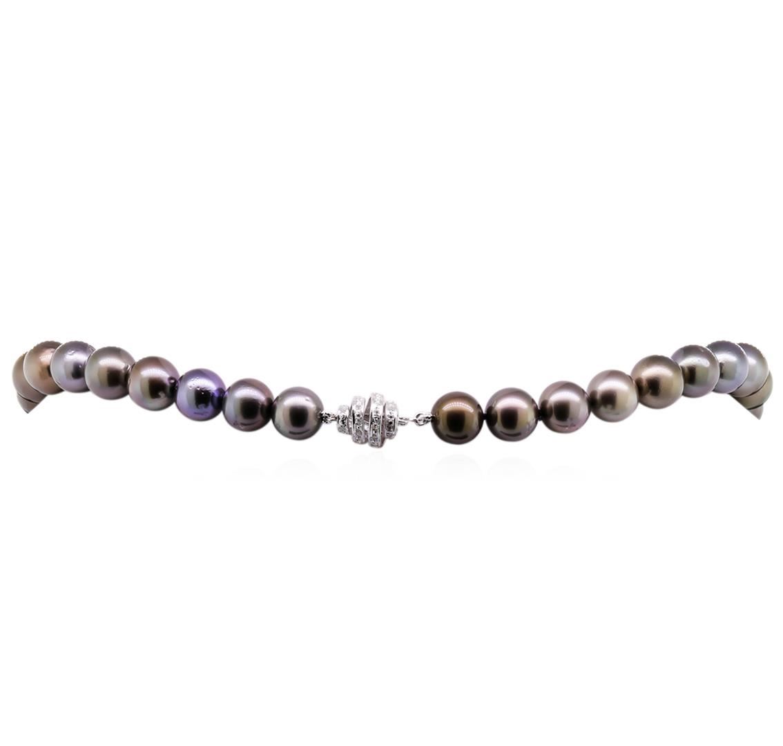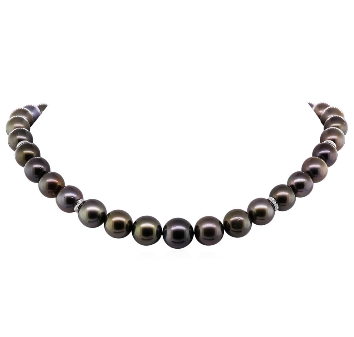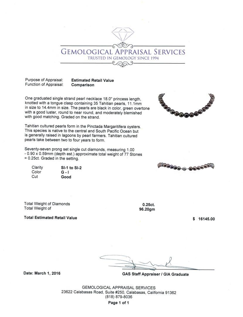 One graduated single strand pearl necklace 18.0" princess length, knotted with a tongue clasp containing 35 Tahitian pearls, 11.1mm in size to 14.4mm in size. The pearls are black in color, green overtone with a good luster, round to near round, and moderately blemished with good matching. Graded on the strand. Tahitian cultured pearls form in the Pinctada Margaritifera oysters. This species is native to the central and South Pacific Ocean but is generally raised in lagoons by pearl farmers. Tahitian cultured pearls take between two to four years to form. Seventy-Seven prong set single cut diamonds, measuring 1.00 - 0.90 x 0.59mm (depth est.) approximate. Total Weight of 77 Stones = 0.25ct. Graded in the setting. Clarity: SI-1 to SI-2. Color: G - I. Cut Good. Total Weight of Diamonds 0.25ct. Total Weight of 96.20gm. GAS Appraised at $16,145.00.
