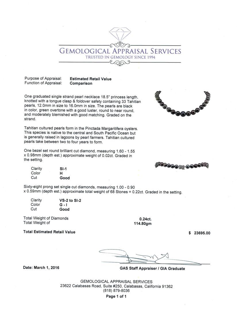 One graduated single strand pearl necklace 18.5" princess length, knotted with a tongue clasp & foldover safety containing 33 Tahitian pearls, 12.0mm in size to 16.0mm in size. The pearls are black in color, green overtone with a good luster, round to near round, and moderately blemished with good matching. Graded on the strand. Tahitian cultured pearls form in the Pinctada Margaritifera oysters. This species is native to the central and South Pacific Ocean but is generally raised in lagoons by pearl farmers. Tahitian cultured pearls take between two to four years to form. One bezel set round brilliant cut diamond, measuring 1.60 - 1.55 x 0.98mm (depth est.) approximate weight of 0.02ct. Graded in the setting. Clarity: SI-1. Color: Good Sixty-Eight prong set single cut diamonds, measuring 1.00 - 0.90 x 0.59mm (depth est.) approximate. Total Weight of 68 Stones = 0.22ct. Graded in the setting. Clarity: VS-2 to SI-2. Color: G - I. Cut Good. Total Weight of Diamonds 0.24ct. Total Weight of 114.80gm. GAS Appraised at $23,695.00.
