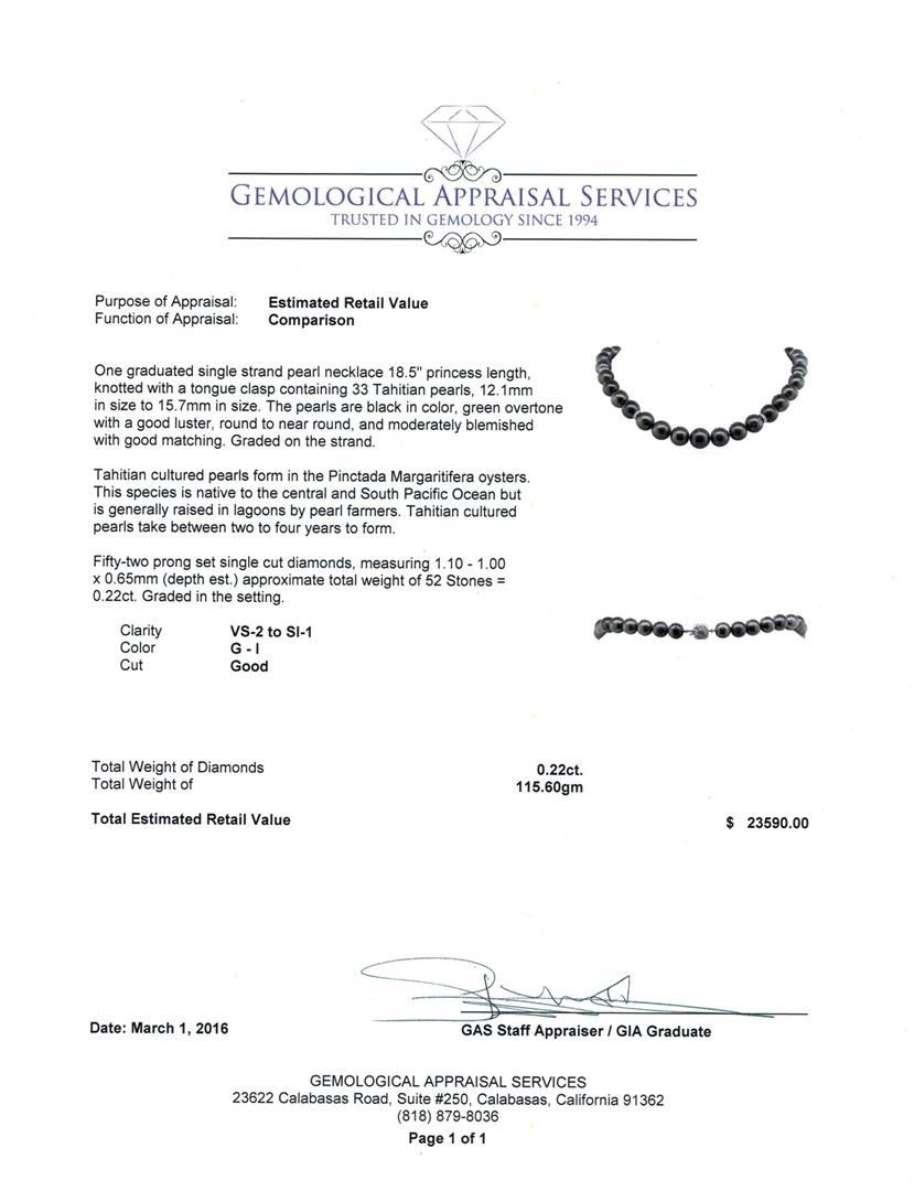 One graduated single strand pearl necklace 18.5" princess length, knotted with a tongue clasp containing 33 Tahitian pearls, 12.1mm in size to 15.7mm in size. The pearls are black in color, green overtone with a good luster, round to near round, and moderately blemished with good matching. Graded on the strand. Tahitian cultured pearls form in the Pinctada Margaritifera oysters. This species is native to the central and South Pacific Ocean but is generally raised in lagoons by pearl farmers. Tahitian cultured pearls take between two to four years to form. Fifty-Two prong set single cut diamonds, measuring 1.10 - 1.00 x 0.65mm (depth est.) approximate. Total Weight of 52 Stones = 0.22ct. Graded in the setting. Clarity: VS-2 to SI-1. Color: G - I. Cut Good. Total Weight of Diamonds 0.22ct. Total Weight of 115.60gm. GAS Appraised at $23,590.00.