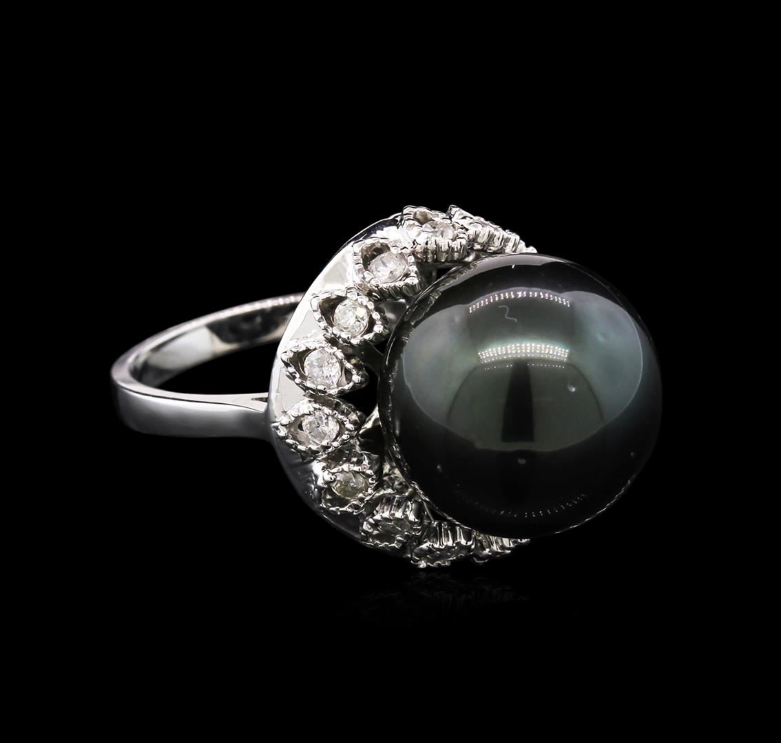 One electronically tested white gold ladies cast Tahitian cultured pearl and diamond ring. Condition is new, good workmanship. The featured Tahitian cultured pearl is set within a stylized diamond bezel, completed by a two and one-half millimeter wide band. Bright polish finish with milgrain detailing. Containing: One Tahitian cultured pearl, 15.0mm in size. The pearl is black in color and exhibiting orient with a high luster, thick nacre, mosey round, lightly spotted Graded in the setting. Tahitian cultured pearls form in the large "Black Lipped" Pinctada Margaritifera oyster, which is about twice the size of the Japanese Akoya oyster. This warm water species from across the central and South Pacific Ocean is at home in the bays and lagoons of the islands & atolls of French Polynesia. Tahitian cultured pearl farmers generally raise their oysters in lagoons. Tahitian cultured pearls take from two to four years to form. Black pearls are known for their iridescent, vibrant, almost metallic natural colors, unique among saltwater cultured pearls. Though commonly called "Tahitian" pearls, they are actually gray, to a lighter or darker degree. Tahitian pearls have the unique ability to display a variety of colors at the same time, which can be seen glistening on their surface. Sixteen half bezel set round brilliant cut diamonds, measuring 2.00 - 1.90 x 1.17mm (depth est.) approximate total weight of 16 Stones = 0.5 let. Graded in the setting. Clarity: I-1 to I-2.Color: H - J. AIG Appraised at $5,905.00.