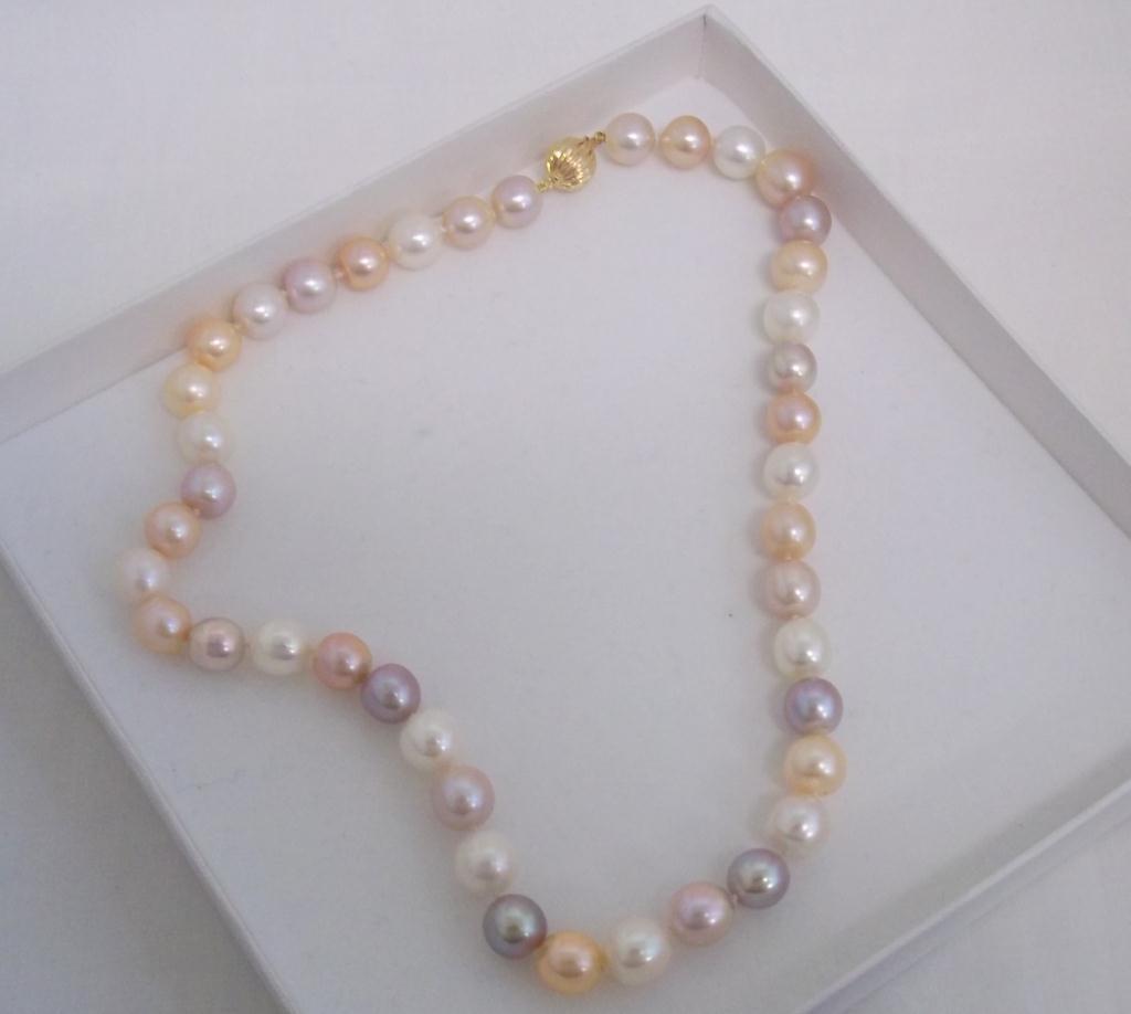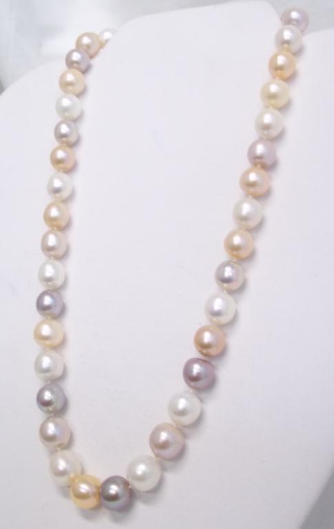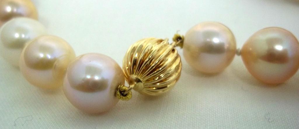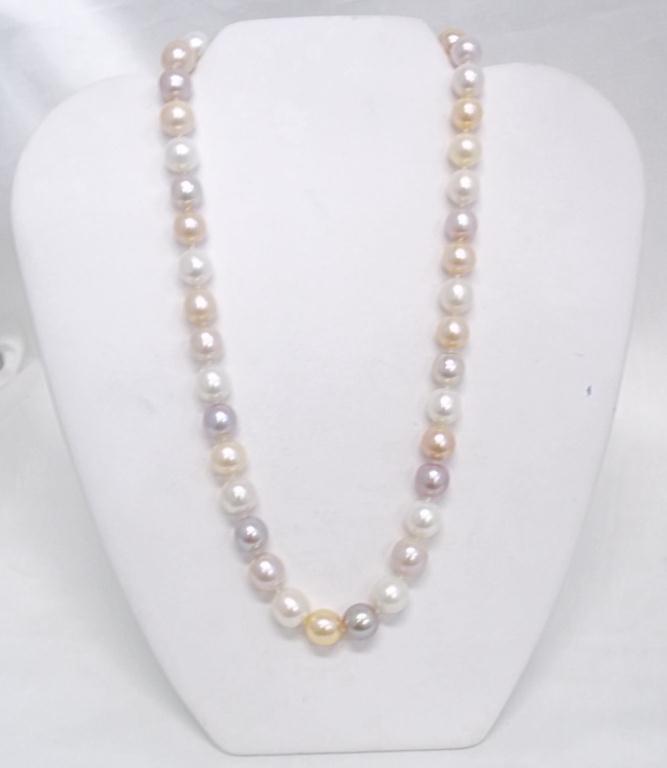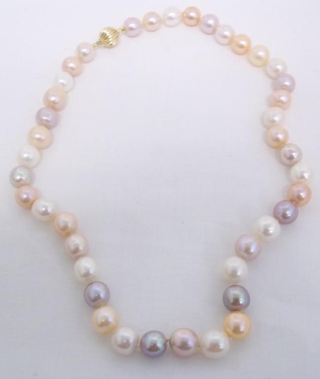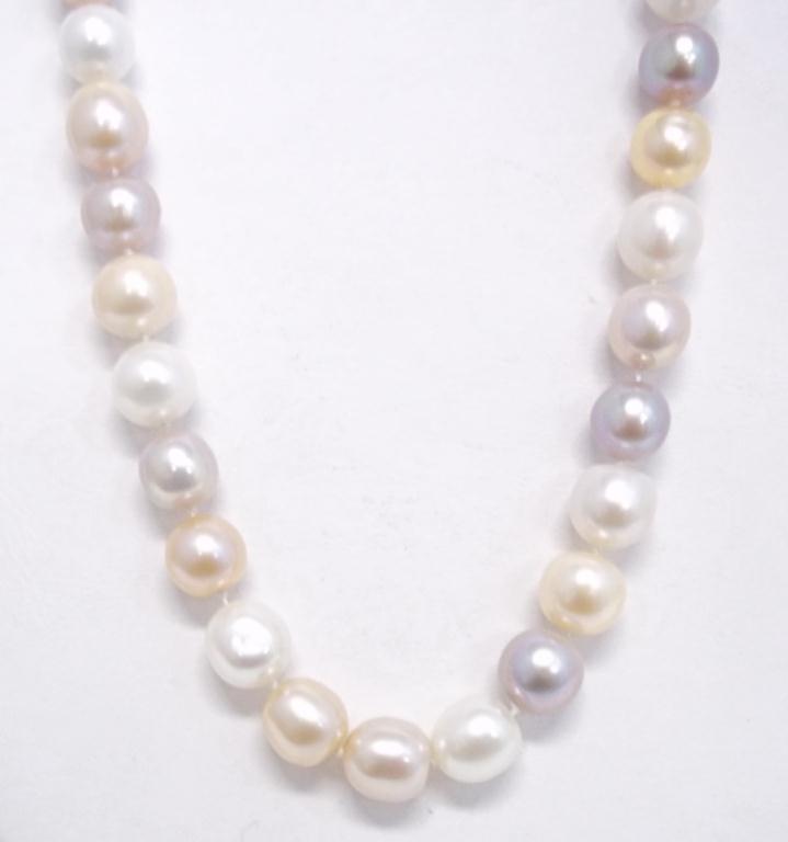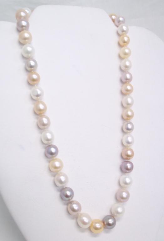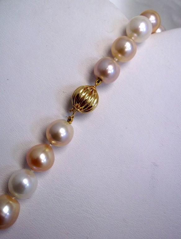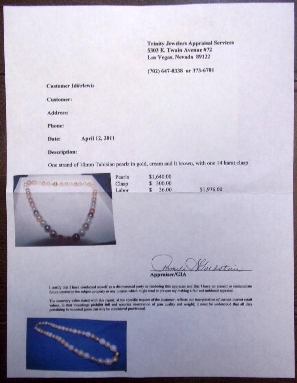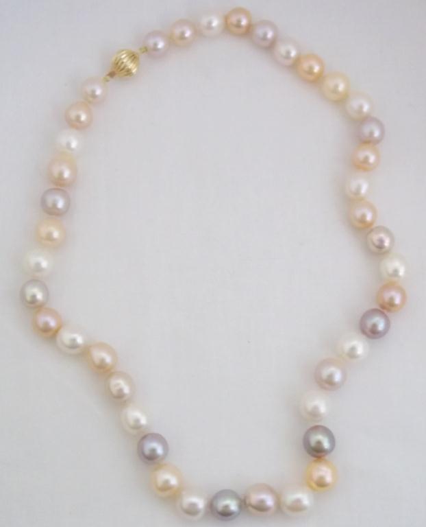 This beautiful one strand Tahitian Pearl Necklace is made with 10mm pearls in gold, cream and light brown with a 14 karet clasp. Letter of Appraisal $1,976.00.