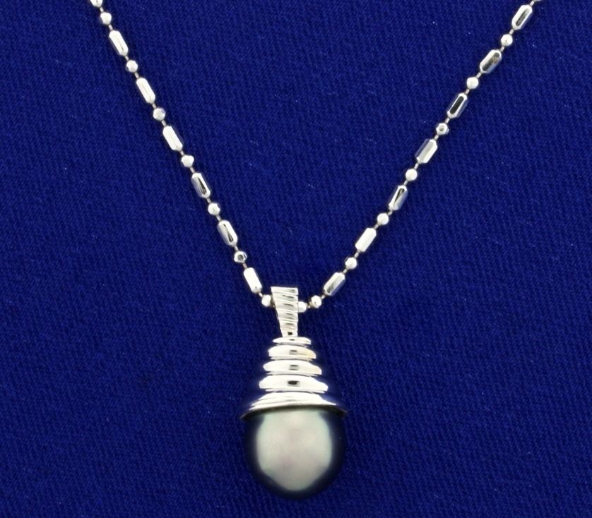 In 14k white gold. Contains a 10mm Tahitian pearl with beautiful silver black color. 16" long chain with lobster clasp and 3/4" long pendant with bale. 7.6g.