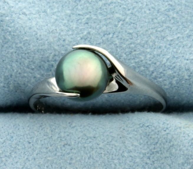 In 14K White Gold. Contains a 6 1/2mm Tahitian Pearl with silver/black color and excellent luster. Size 6 1/4. 1.7g