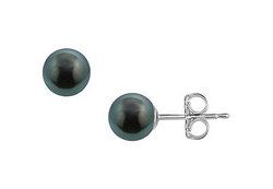 Reflecting a high luster and sheen a pair of flawless round Tahitian pearl stud earrings with a size of 8 mm is made in 18K white gold. These Tahitian pearl studs are available in either screw-back or push-back.
