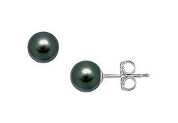 Reflecting a high luster and sheen a pair of flawless round Tahitian pearl stud earrings with a size of 8 mm is made in 18K white gold. These Tahitian pearl studs are available in either screw-back or push-back.