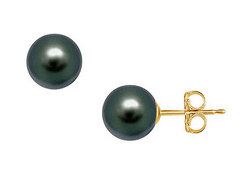 Reflecting a high luster and sheen a pair of flawless round Tahitian pearl stud earrings with a size of 12 mm is made in 18K yellow gold. These Tahitian pearl studs are available in either screw-back or push-back.
