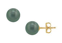 Reflecting a high luster and sheen a pair of flawless round Tahitian pearl stud earrings with a size of 13 mm is made in 18K yellow gold. These Tahitian pearl studs are available in either screw-back or push-back.