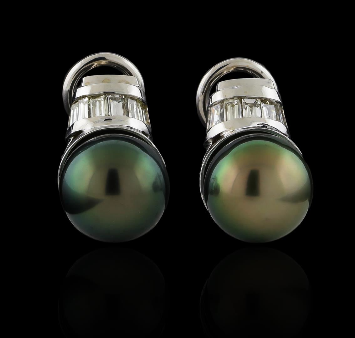 One pair electronically tested 14KT white gold ladies cast & assembled Tahitian cultured pearl and diamond earrings with omega backs. Bright polish finish. Identified with markings of "14K". Condition is new, good workmanship. Containing: Two Tahitian cultured pearls, 10.0mm in size. The pearls are black in color with a good luster, round, clean Graded in the setting. Tahitian cultured pearls form in the large "Black Lipped" Pinctada Margaritifera oyster, which is about twice the size of the Japanese Akoya oyster. This warm water species from across the central and South Pacific Ocean is at home in the bays and lagoons of the islands & atolls of French Polynesia. Tahitian cultured pearl farmers generally raise their oysters in lagoons. Tahitian cultured pearls take from two to four years to form. Black pearls are known for their iridescent, vibrant, almost metallic natural colors, unique among saltwater cultured pearls. Though commonly called "Tahitian" pearls, they are actually gray, to a lighter or darker degree. Tahitian pearls have the unique ability to display a variety of colors at the same time, which can be seen glistening on their surface. Eleven channel set baguette cut diamonds, measuring from 2.40 x 1.50 x 1.05mm to 2.70 x 1.70 x 1.19mm exact total weight 11 Stones = 0.65ct. Graded in the setting. Clarity: VS-2 to SI-1. Color: I - K. Total Weight of Diamonds 0.65ct. Total Weight of Earrings 9.55gm. AIG Appraised at $4,090.00.