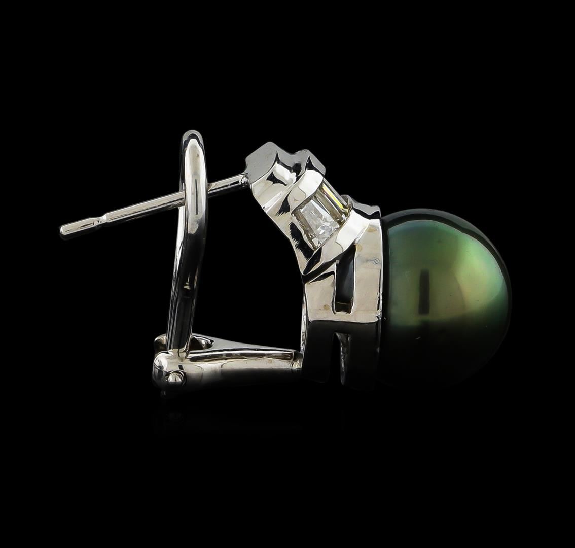 One pair electronically tested 14KT white gold ladies cast & assembled Tahitian cultured pearl and diamond earrings with omega backs. Bright polish finish. Identified with markings of "14K". Condition is new, good workmanship. Containing: Two Tahitian cultured pearls, 10.0mm in size. The pearls are black in color with a good luster, round, clean Graded in the setting. Tahitian cultured pearls form in the large "Black Lipped" Pinctada Margaritifera oyster, which is about twice the size of the Japanese Akoya oyster. This warm water species from across the central and South Pacific Ocean is at home in the bays and lagoons of the islands & atolls of French Polynesia. Tahitian cultured pearl farmers generally raise their oysters in lagoons. Tahitian cultured pearls take from two to four years to form. Black pearls are known for their iridescent, vibrant, almost metallic natural colors, unique among saltwater cultured pearls. Though commonly called "Tahitian" pearls, they are actually gray, to a lighter or darker degree. Tahitian pearls have the unique ability to display a variety of colors at the same time, which can be seen glistening on their surface. Eleven channel set baguette cut diamonds, measuring from 2.40 x 1.50 x 1.05mm to 2.70 x 1.70 x 1.19mm exact total weight 11 Stones = 0.65ct. Graded in the setting. Clarity: VS-2 to SI-1. Color: I - K. Total Weight of Diamonds 0.65ct. Total Weight of Earrings 9.55gm. AIG Appraised at $4,090.00.