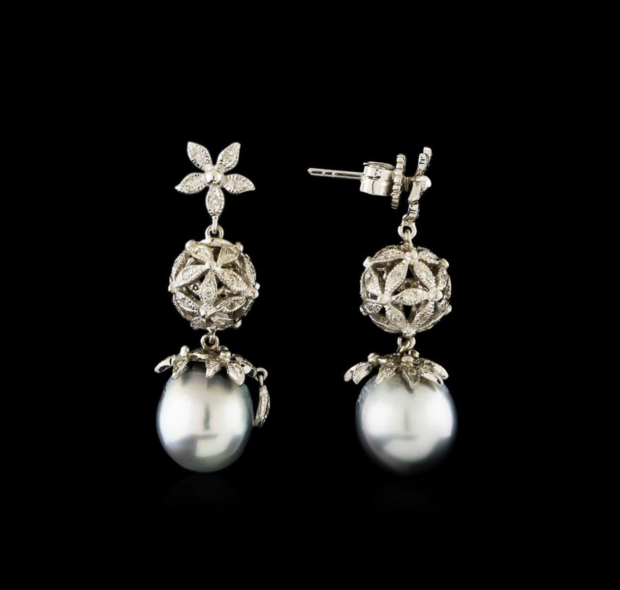 One pair electronically tested 14KT white gold lady's combination cast & assembled dangle earrings with friction posts with a bright polish with milgrain detailing finish. The featured lady's earrings have a drop of approximately 35 millimeters. Identified with markings of "K14". Condition is new, good workmanship. Containing: Two Tahitian pearls, 12.5mm in size to 10.4mm in size. The pearls are silver in color with a good luster, drop shape, and lightly blemished with very good matching. Graded in the setting. Ninety prong set round brilliant cut diamonds, measuring 1.15 - 1.05 x 0.68mm (depth est.) approximate total weight of 90 Stones = 0.45ct. Graded in the setting. Clarity: SI-1 to I-1. Color: H - I. Cut Good. Total Weight of Diamonds 0.45ct. Total Weight of Earrings 10.30gm. GAS Appraised.