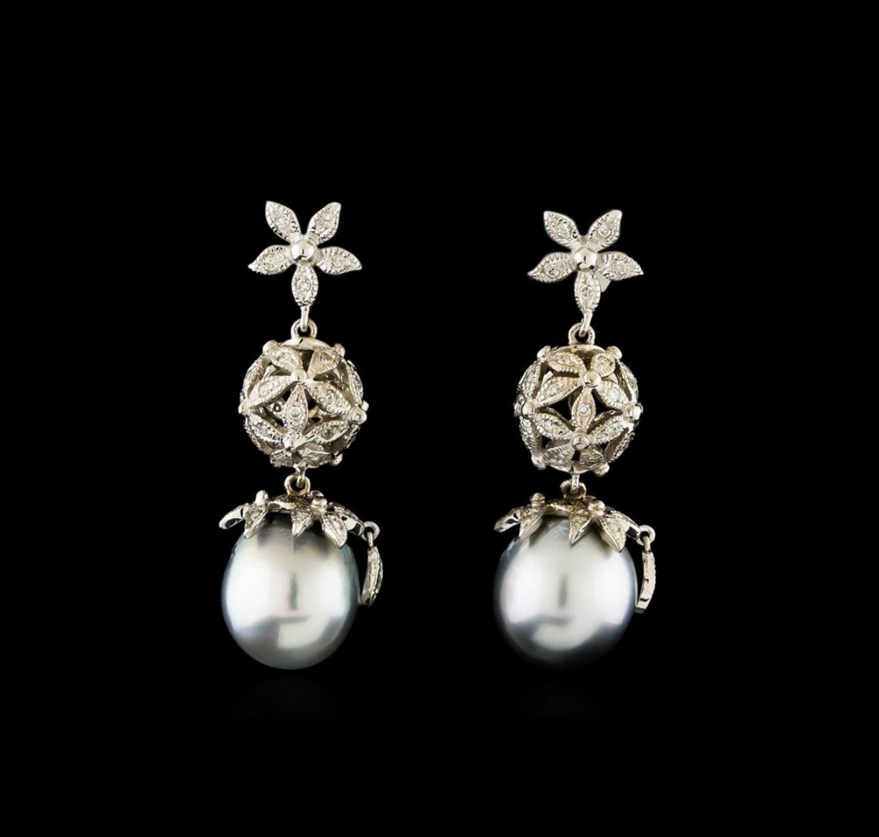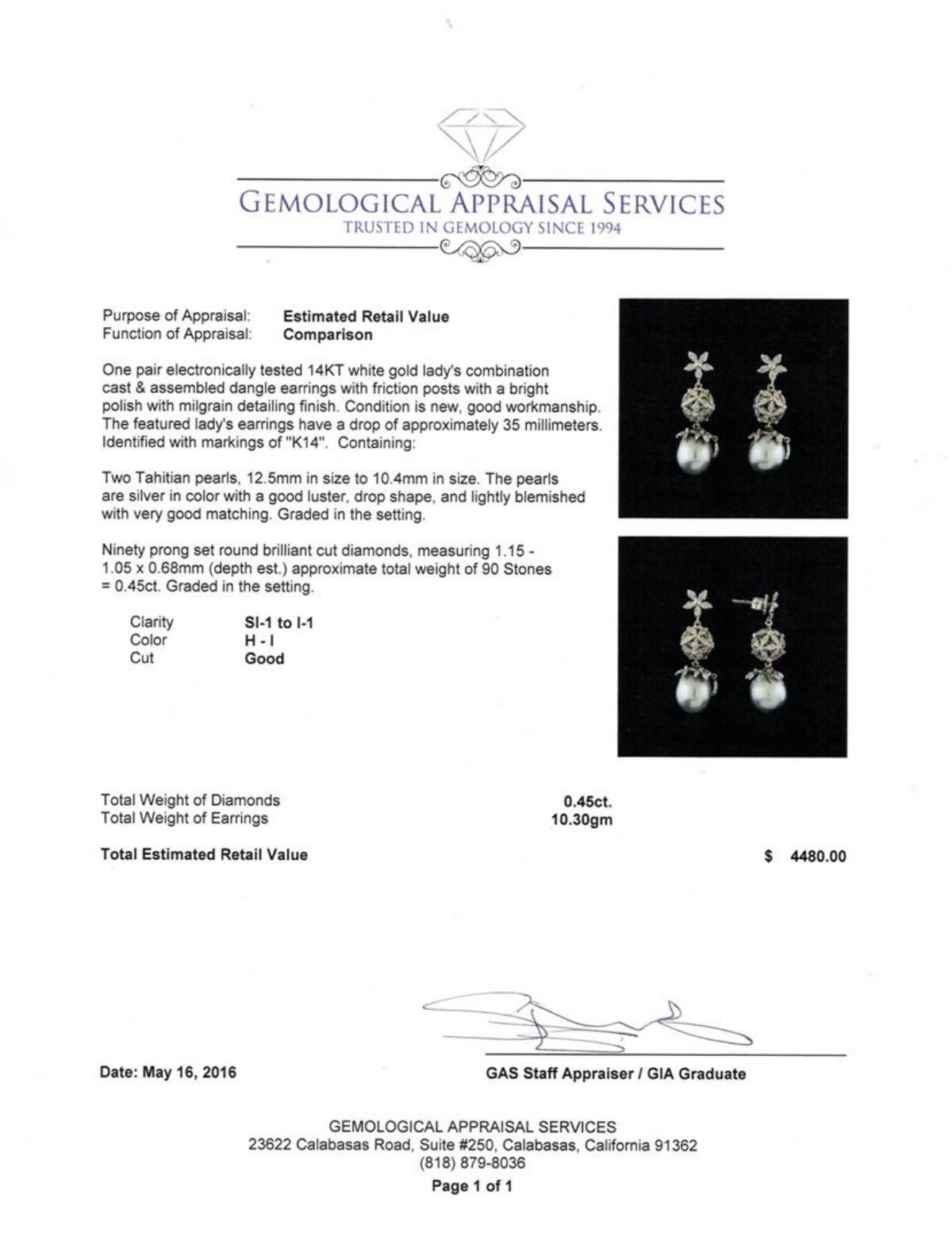 One pair electronically tested 14KT white gold lady's combination cast & assembled dangle earrings with friction posts with a bright polish with milgrain detailing finish. The featured lady's earrings have a drop of approximately 35 millimeters. Identified with markings of "K14". Condition is new, good workmanship. Containing: Two Tahitian pearls, 12.5mm in size to 10.4mm in size. The pearls are silver in color with a good luster, drop shape, and lightly blemished with very good matching. Graded in the setting. Ninety prong set round brilliant cut diamonds, measuring 1.15 - 1.05 x 0.68mm (depth est.) approximate total weight of 90 Stones = 0.45ct. Graded in the setting. Clarity: SI-1 to I-1. Color: H - I. Cut Good. Total Weight of Diamonds 0.45ct. Total Weight of Earrings 10.30gm. GAS Appraised.