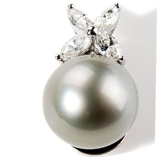This beautiful Tahitian pearl and diamond pendant is set in 14kt. white gold comes on an 18-inch, 14kt. white gold chain. The pendant features an 11mm gray Tahitian cultured pearl and .38ctw. diamonds (4 marquise, prong set, VS1-VS2 diamonds).