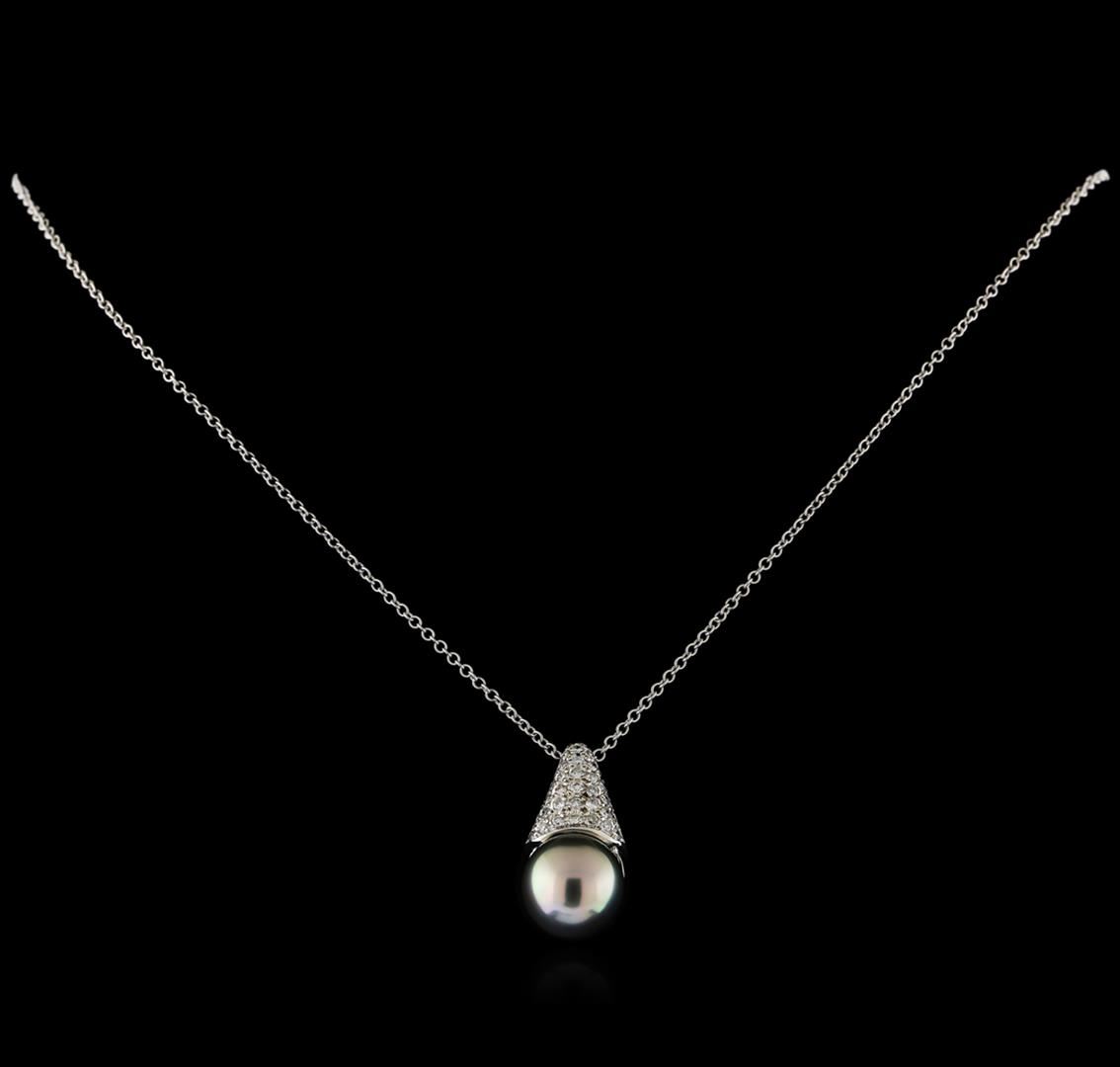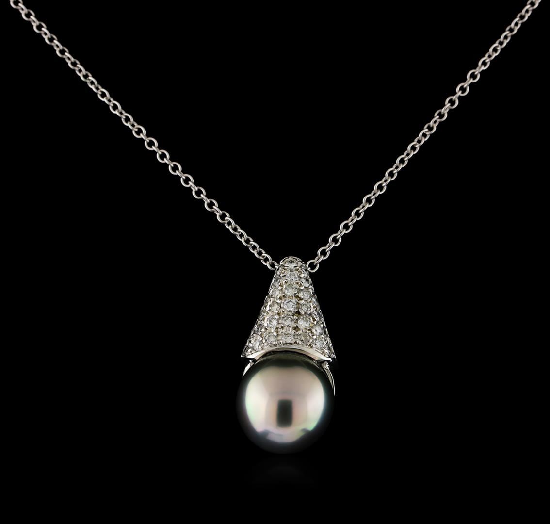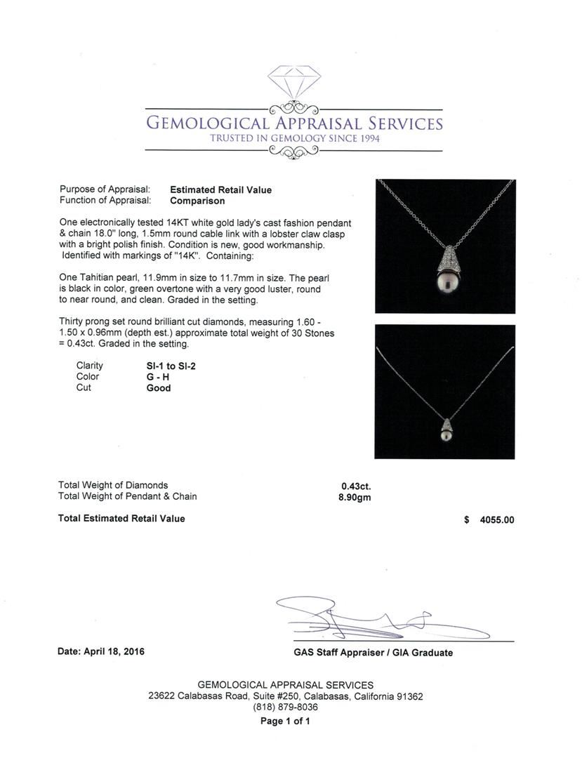 One electronically tested 14KT white gold lady's cast fashion pendant & chain 18.0" long, 1.5mm round cable link with a lobster claw clasp with a bright polish finish. Identified with markings of "14K". Condition is new, good workmanship. Containing: One Tahitian pearl, 11.9mm in size to 11.7mm in size. The pearl is black in color, green overtone with a very good luster, round to near round, and clean. Graded in the setting. Thirty prong set round brilliant cut diamonds, measuring 1.60 - 1.50 x 0.96mm (depth est.) approximate total weight of 30 Stones = 0.43ct. Graded in the setting. Clarity: SI-1 to SI-2. Color: G - Good. Total Weight of Diamonds 0.43ct. Total Weight of Pendant & Chain 8.90gm. GAS Appraised at $4,055.00.