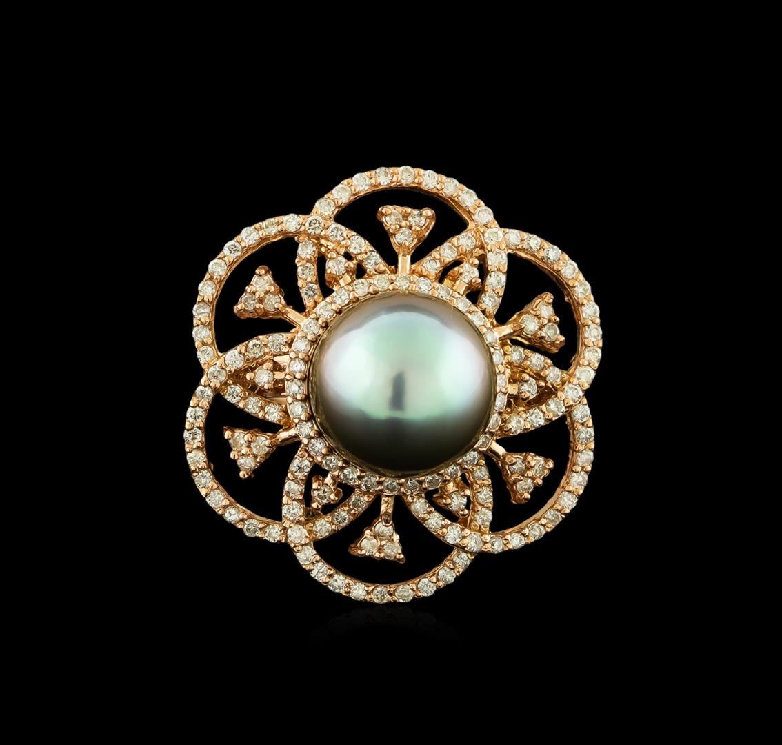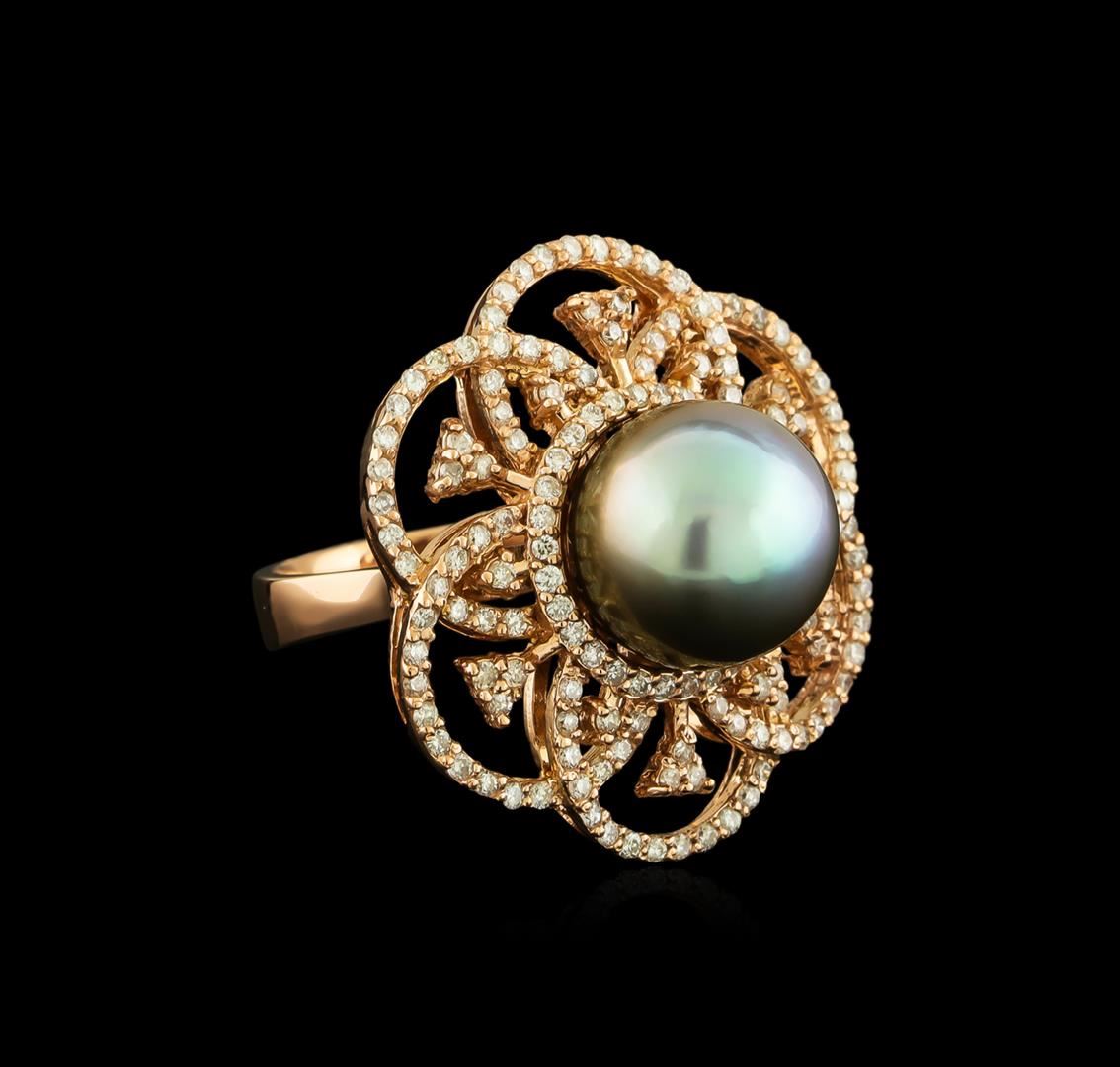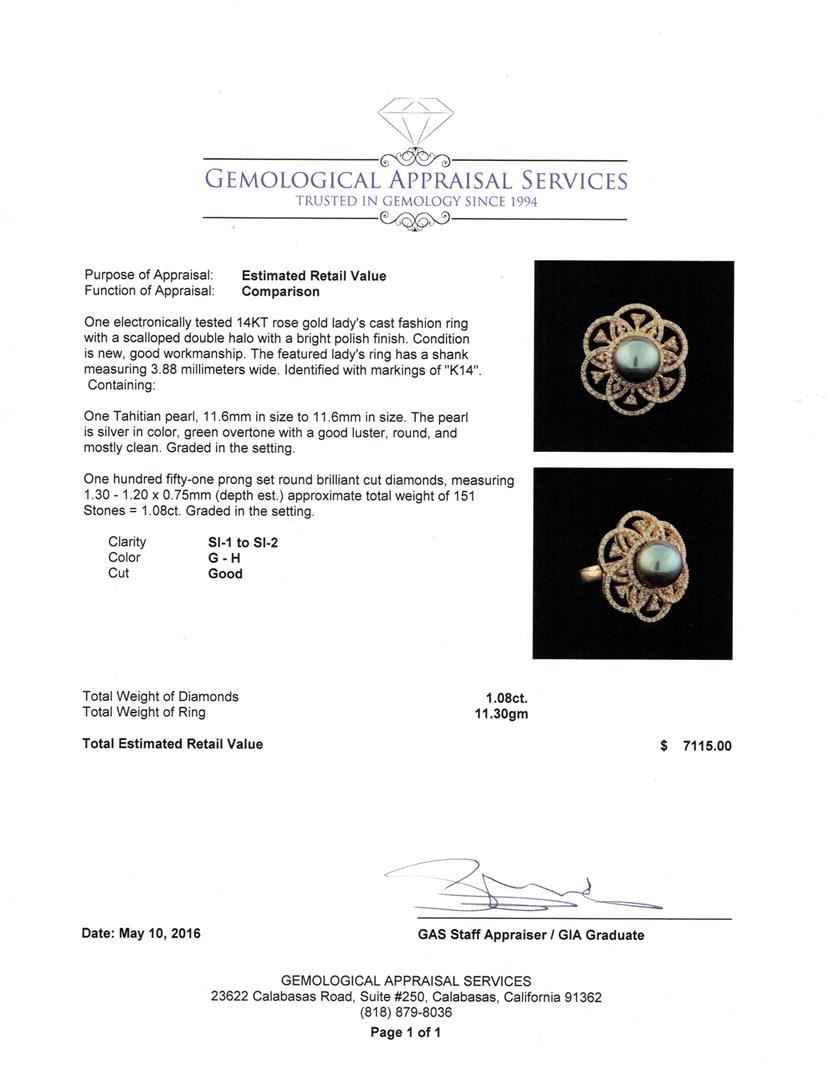 One electronically tested 14KT rose gold lady's cast fashion ring with a scalloped double halo with a bright polish finish. The featured lady's ring has a shank measuring 3.88 millimeters wide. Identified with markings of "K14". Condition is new, good workmanship. Containing: One Tahitian pearl, 11.6mm in size to 11.6mm in size. The pearl is silver in color, green overtone with a good luster, round, and mostly clean. Graded in the setting. One Hundred Fifty-One prong set round brilliant cut diamonds, measuring 1.30 - 1.20 x 0.75mm (depth est.) approximate total weight of 151 Stones = 1.08ct. Graded in the setting. Clarity: SI-1 to SI-2. Color: G - Good. Total Weight of Diamonds 1.08ct. Total Weight of Ring 11.30gm. GAS Appraised at $7,115.00.