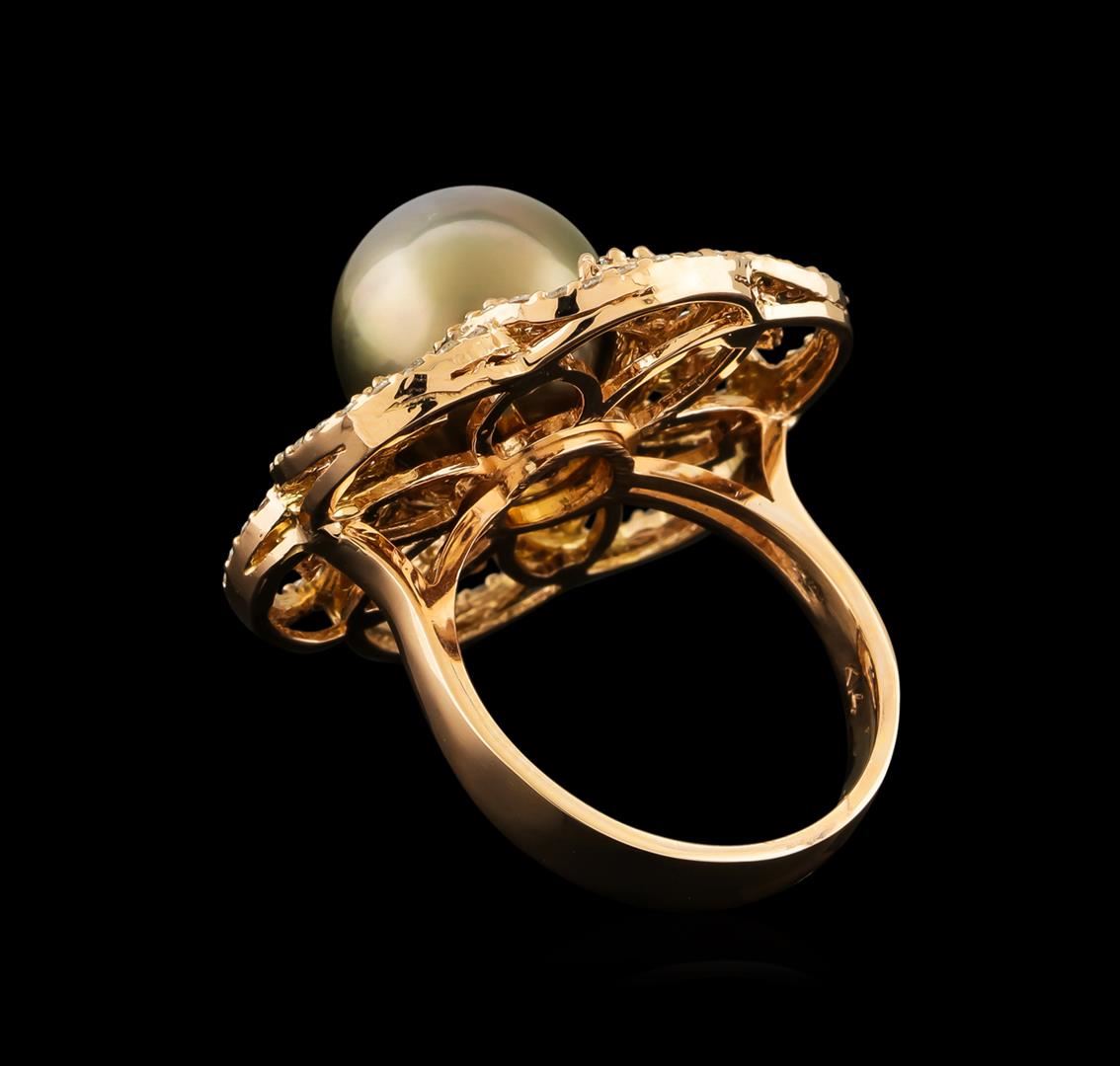 One electronically tested 14KT rose gold lady's cast fashion ring with a scalloped double halo with a bright polish finish. The featured lady's ring has a shank measuring 3.88 millimeters wide. Identified with markings of "K14". Condition is new, good workmanship. Containing: One Tahitian pearl, 11.6mm in size to 11.6mm in size. The pearl is silver in color, green overtone with a good luster, round, and mostly clean. Graded in the setting. One Hundred Fifty-One prong set round brilliant cut diamonds, measuring 1.30 - 1.20 x 0.75mm (depth est.) approximate total weight of 151 Stones = 1.08ct. Graded in the setting. Clarity: SI-1 to SI-2. Color: G - Good. Total Weight of Diamonds 1.08ct. Total Weight of Ring 11.30gm. GAS Appraised at $7,115.00.